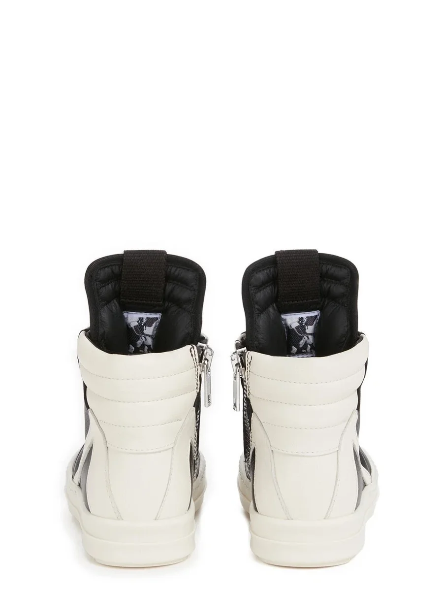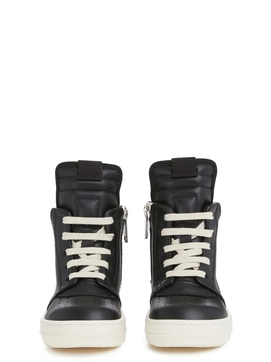 THESE BABYGEOS ADAPT THE SIGNATURE RICK OWENS GEOBASKET SHAPE FOR INFANTS AND ARE CRAFTED FOR FIRST STEPS. THEY HAVE LACES, A SIDE ZIPPER FOR EASY FASTENING AND GEOMETRIC SEAMS WITH VISIBLE STITCHING AND SHARK-TOOTH SOLES.