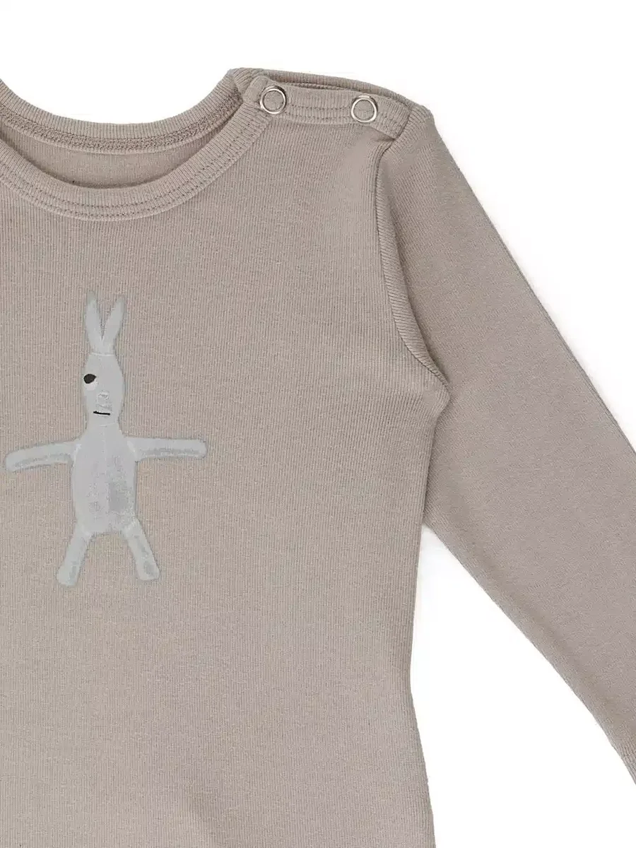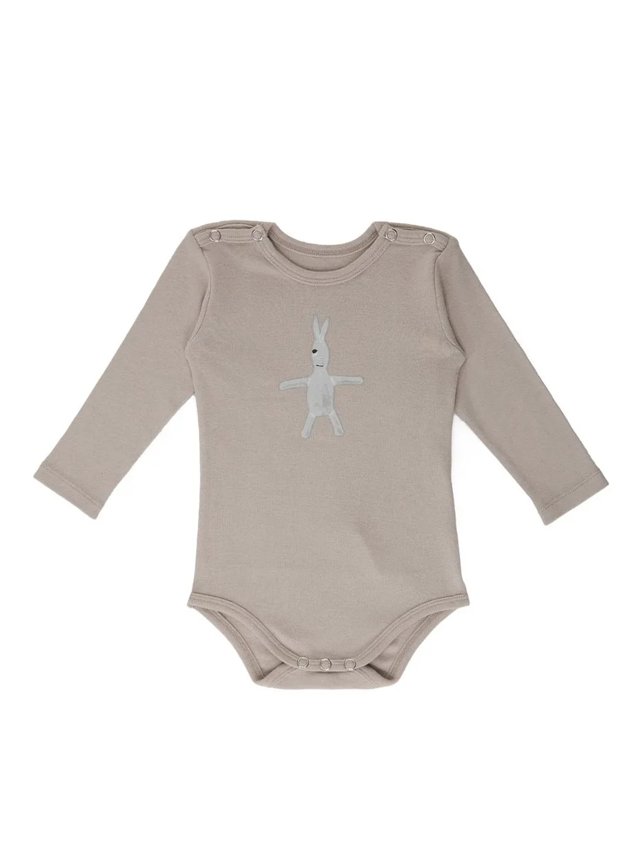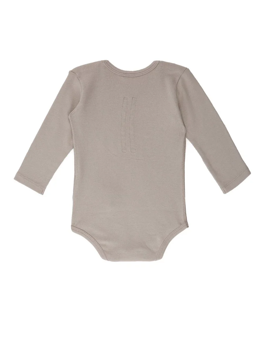 THIS BODY HAS LONG SLEEVES, A ROUND NECK WITH SHOULDER SNAPS AND SNAPS ON CROTCH.