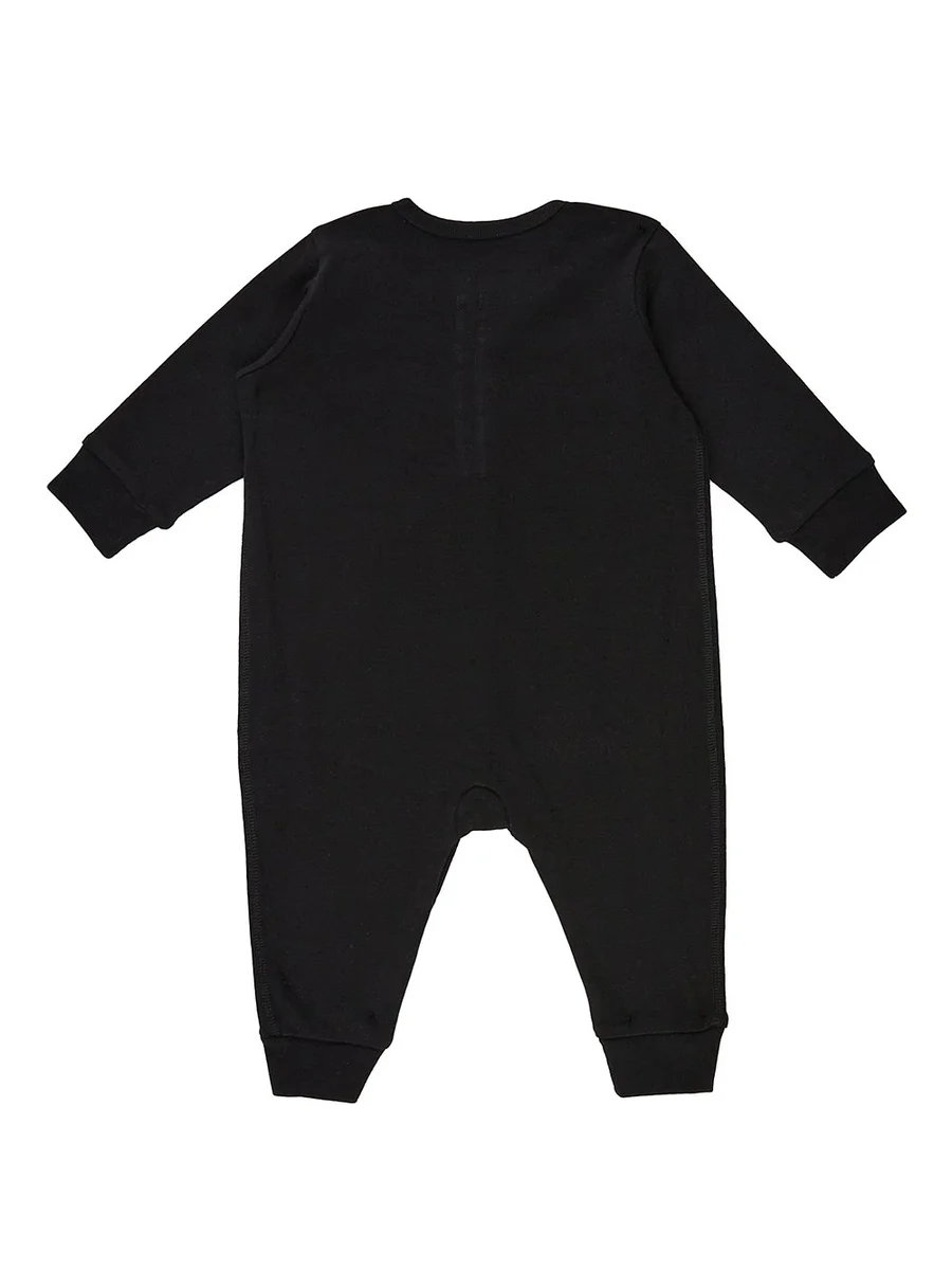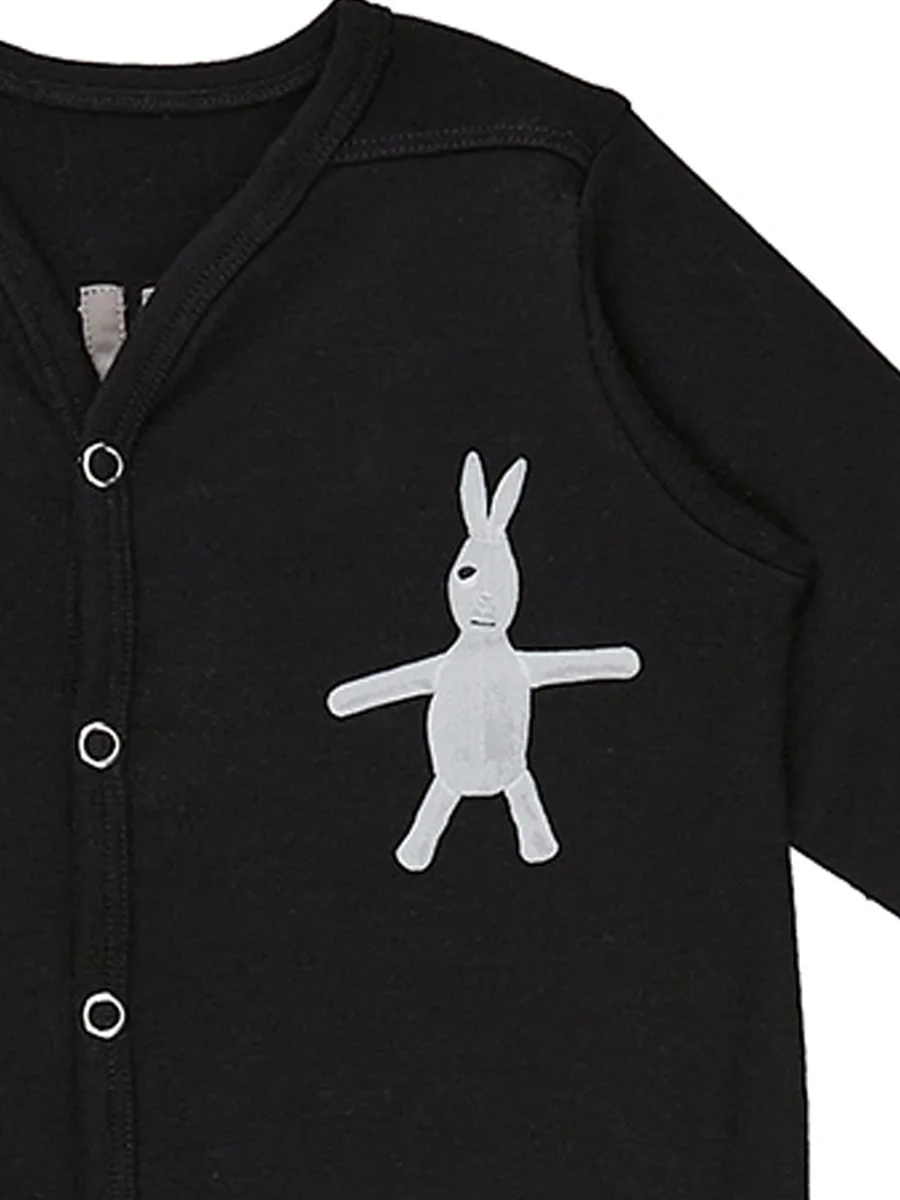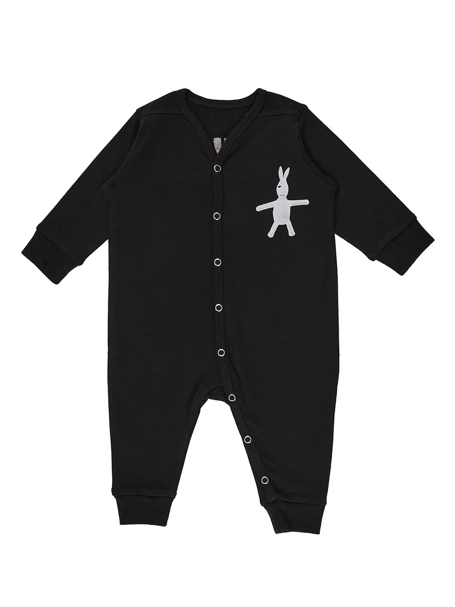 THIS BODY LONG HAS LONG SLEEVES AND LEGS WITH RIBBED WRISTS AND ANKLES. IT HAS A SLIGHT V NECK WITH SNAPS ALL ROUND.