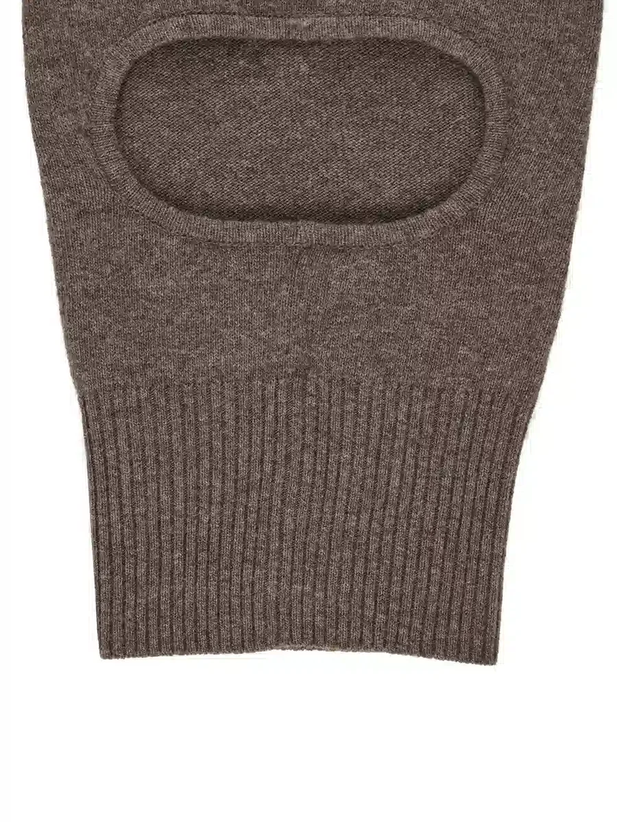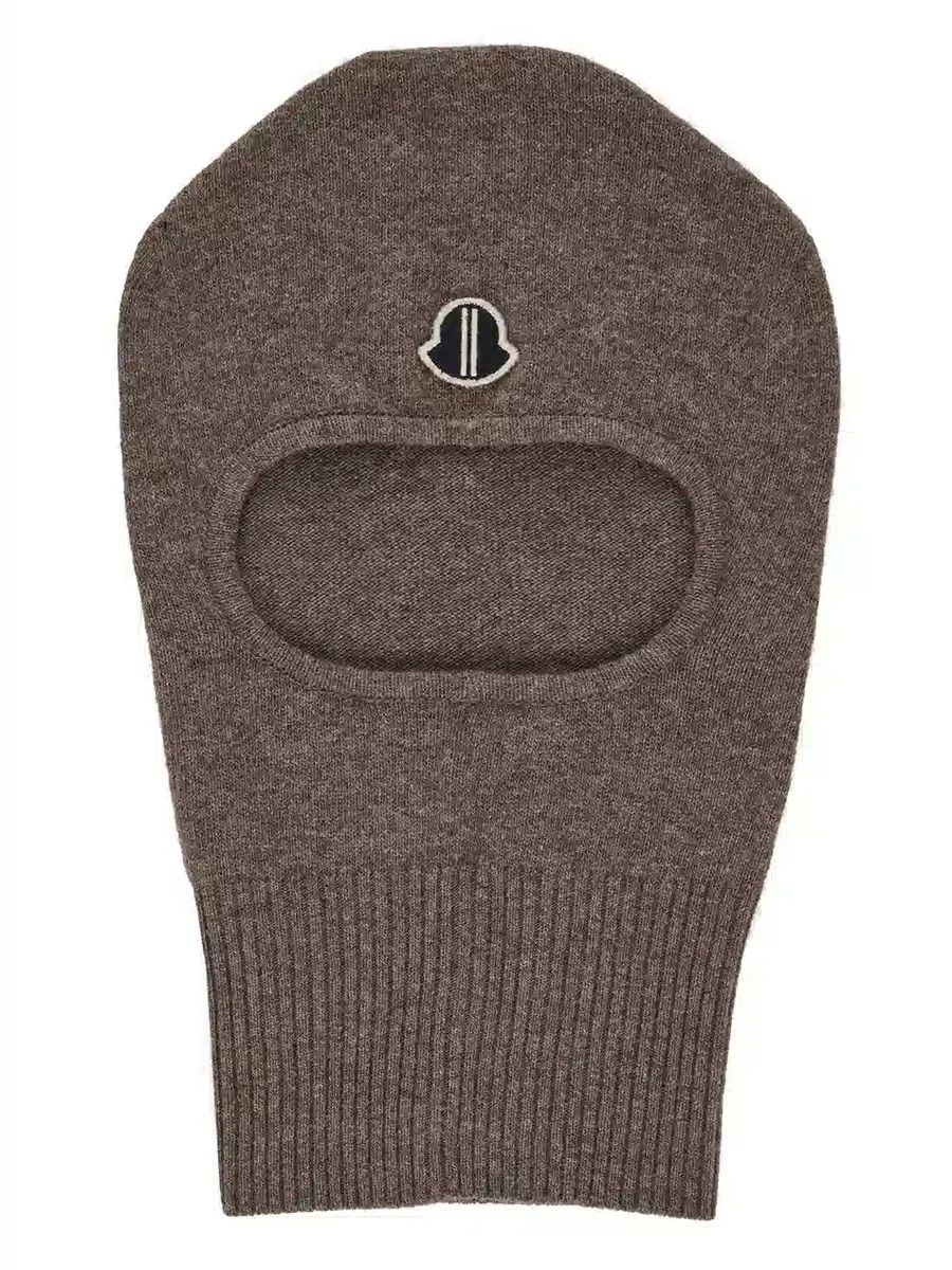 THIS KNIT SKULL IS A BALACLAVA THAT COVERS THE HEAD AND NECK WITH A WIDE ROUNDED OPENING FOR THE FACE AND A WIDE RIBBED NECK. IT HAS AN EMBROIDERED RICK OWENS +MONCLER PATCH ON THE FOREHEAD.