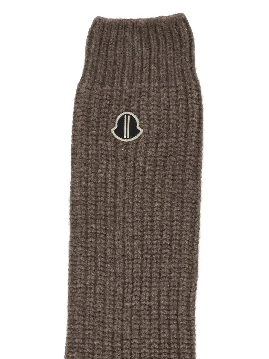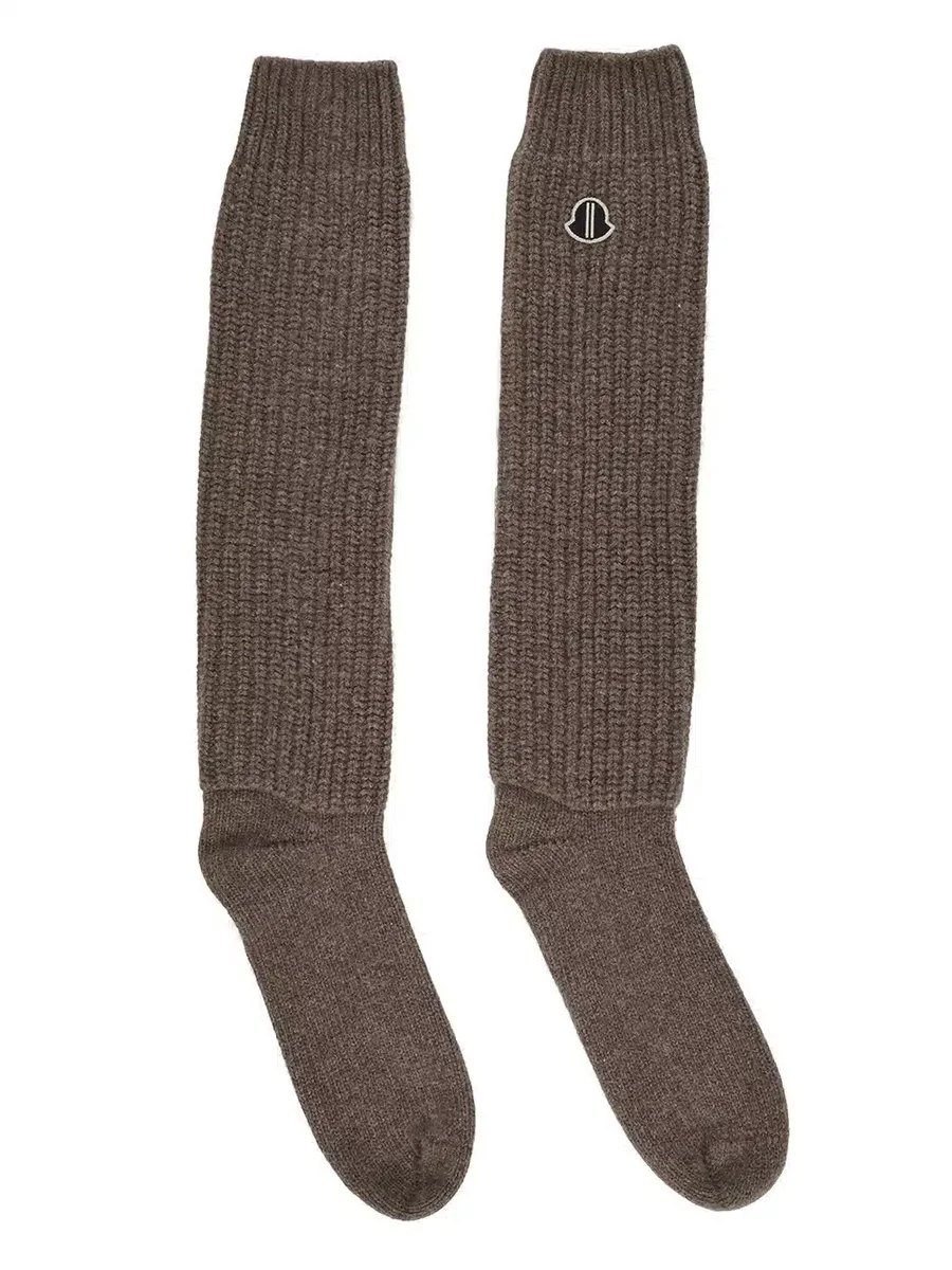 THESE KNIT SOCKS ARE BELOW KNEE LENGTH. THEY FEATURE A RIB KNIT LEG AND THE MONCLER +RICK OWENS EMBROIDERED LOGO PATCH ON THE TOP OUTER LEFT LEG.