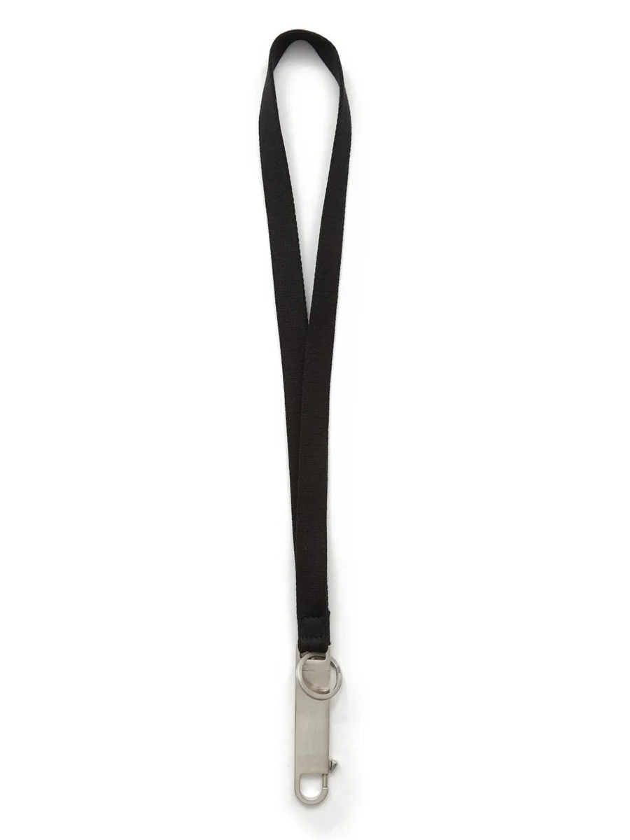 THIS LARGE NECK HOOK KEYCHAIN FEATURES A BIG SNAP HOOK IN PALLADIUM TONE BRASS ATTACHED TO A COTTON WEBBING STRAP AND A ROUND KEYRING. IT IS ENGRAVED WITH THE RICK OWENS LOGO.