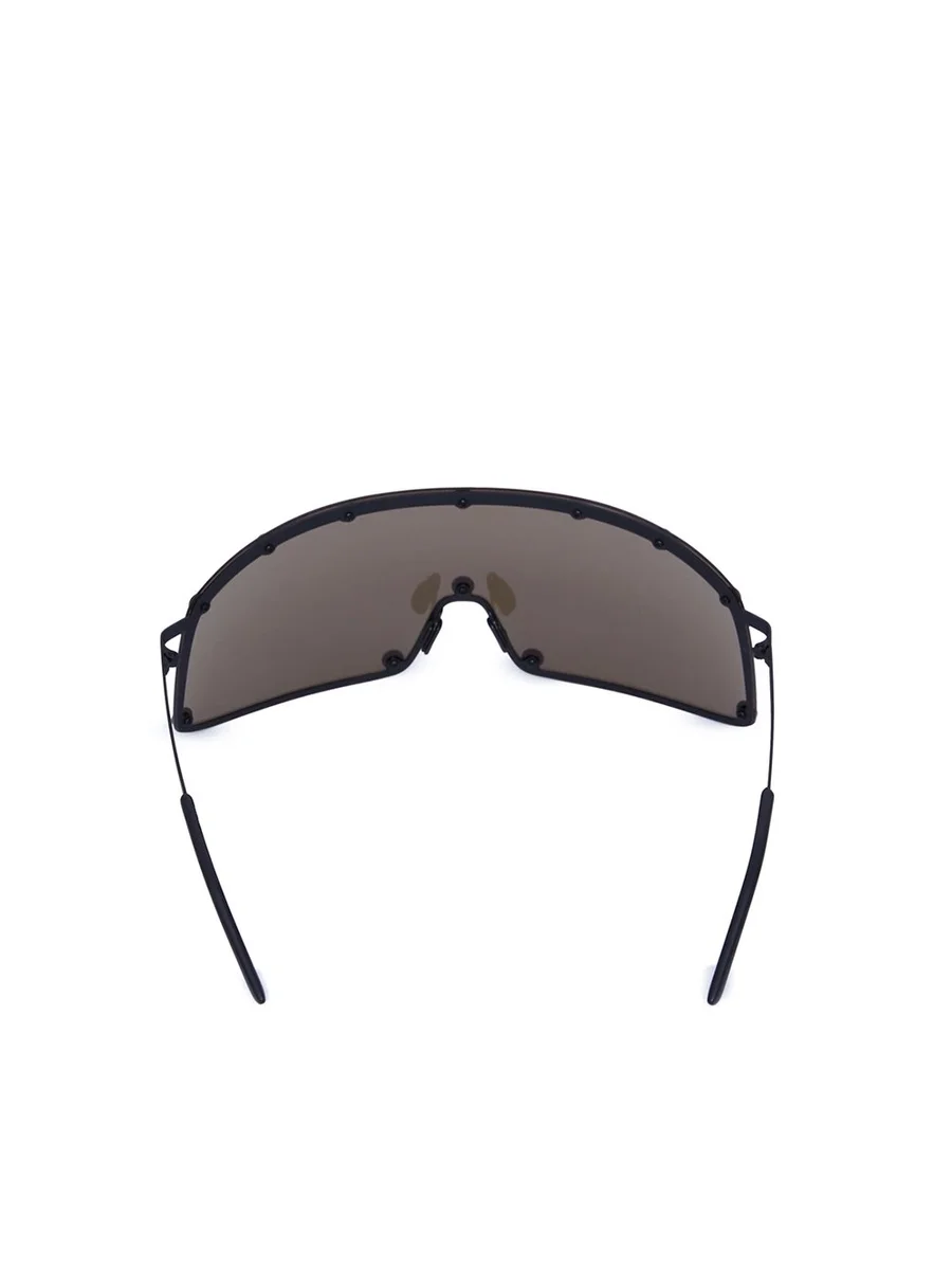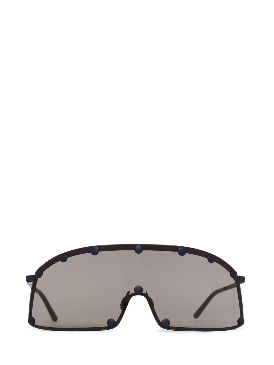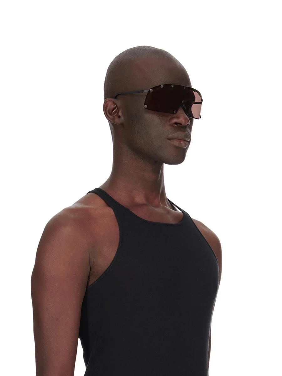 THESE SUNGLASSES FEATURE A BLACK SURGICAL STAINLESS STEEL FRAME, A STRAIGHT-BOTTOMED BROWN LENSE AND A RUBBER NOSE PAD.