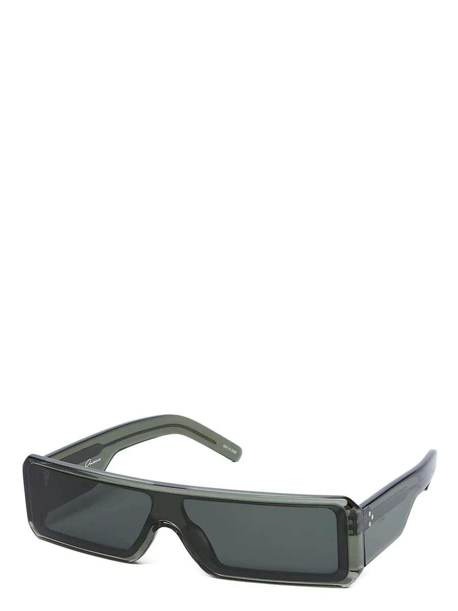 THESE GETH SUNGLASSES FEATURE A SLEEK AND SLIM RECTANGULAR BLACK ACETATE FRAME WITH A SINGLE CUT LENS. THEY HAVE WIDE ARMS WITH THE SIGNATURE TRIO OF SILVER RIVETS ON EACH TEMPLE AND RICK OWENS LOGO ON INSIDE RIGHT.