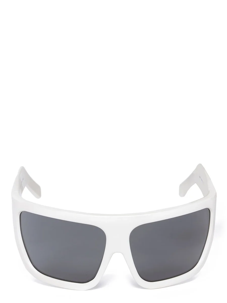 THESE DAVIS SUNGLASSES ARE LARGE WRAP AROUND FRAMES WITH GEOMETRIC CURVED LENSES. THEY HAVE THICK ANGLED ARMS AND RICK OWENS LOGO ON INSIDE RIGHT.
