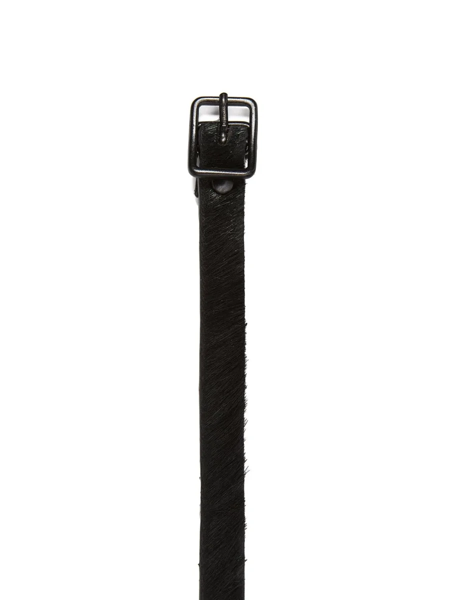 THIS CHOKER IS MADE FROM A STRAP OF HEAVYWEIGHT HAIR-ON COWHIDE. IT IS ADJUSTABLE WITH NINETEEN HOLES AND A SMALL BUCKLE AT ONE END. IT IS EMBOSSED WITH THE RICK OWENS LOGO.