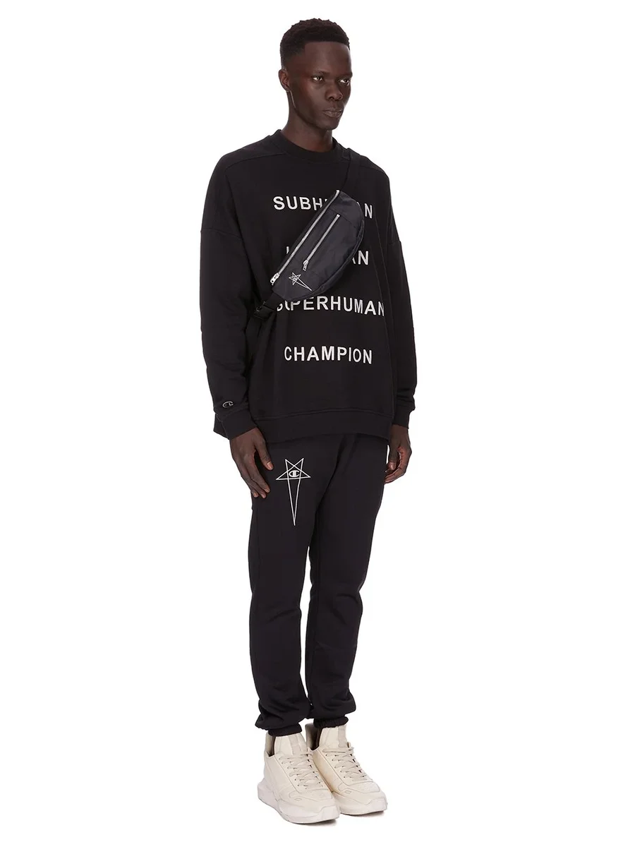 IT FEATURES A SMALL 3D CHAMPION X RICK OWENS PENTAGRAM LOGO PATCH ON FRONT RIGHT.