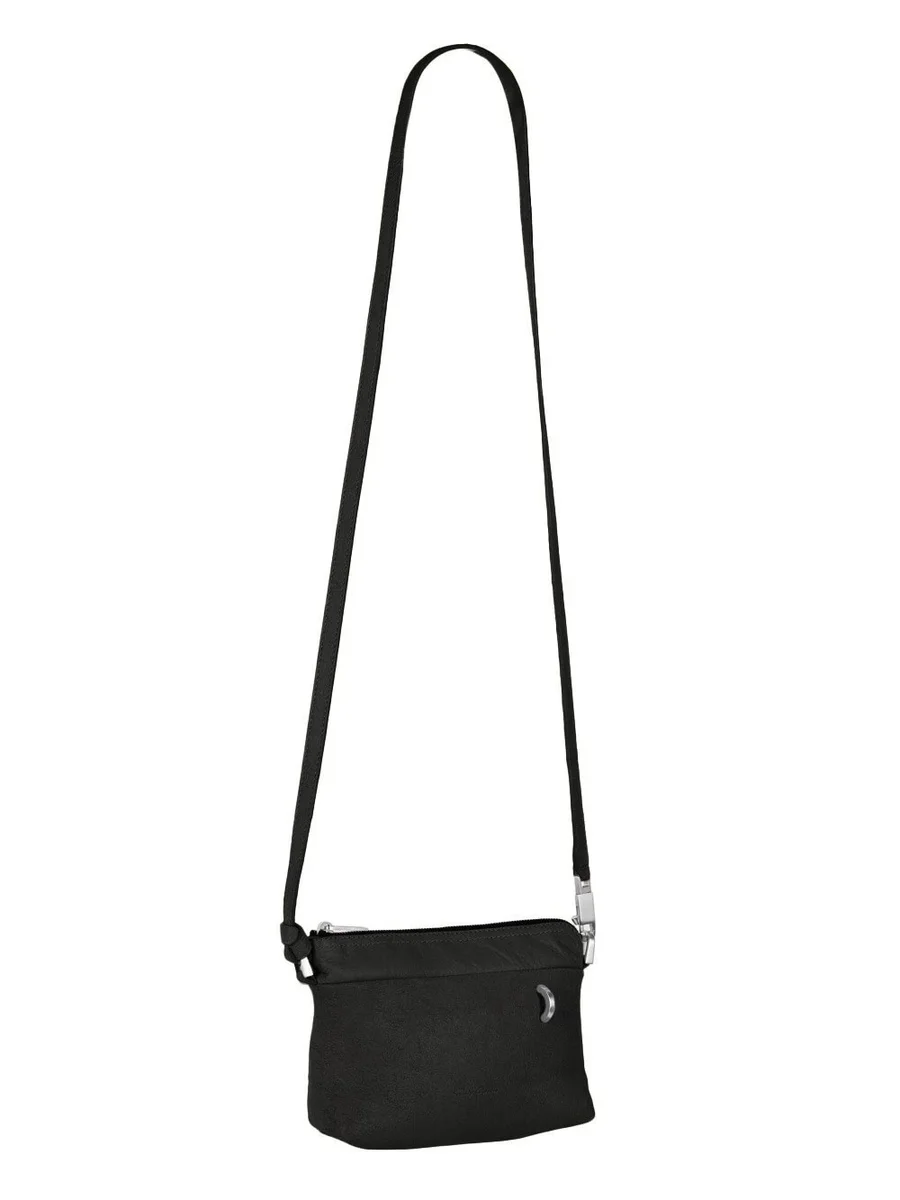THIS SMALL ADRI IS A RECTANGULAR POUCH WITH TOP ZIPPER CLOSURE, A PONTICELLO D-LOOP DETAIL AND A LONG, THIN, ADJUSTABLE LEATHER STRAP, WITH SMALL PALLADIUM TONE BRASS SNAP HOOKS AND D-RINGS.