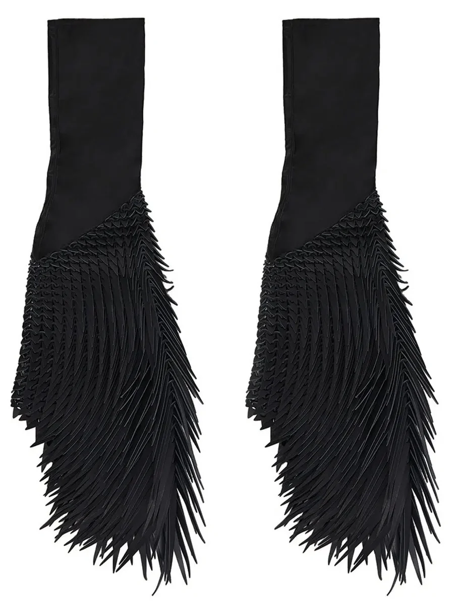 THIS CHAIN MAIL FOR TACO KISS ATTACHES TO THE FRONT OF THE TACO KISS USING THREE SNAP, HIDDEN ON THE INNER TOP SIDE. IT THEN DRAPES OVER THE LOWER LEG, COVERING THE KISS BOOT, LEAVING ONLY THE HEEL VISIBLE.