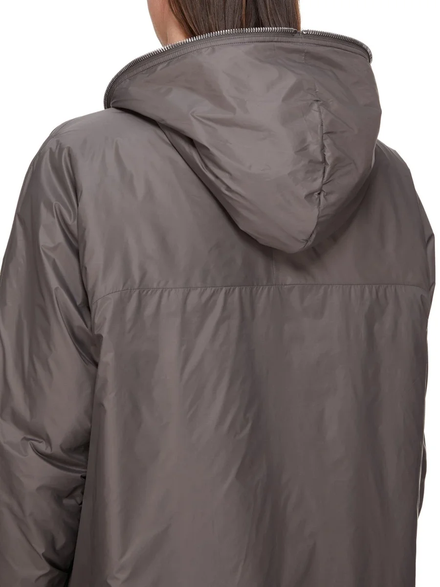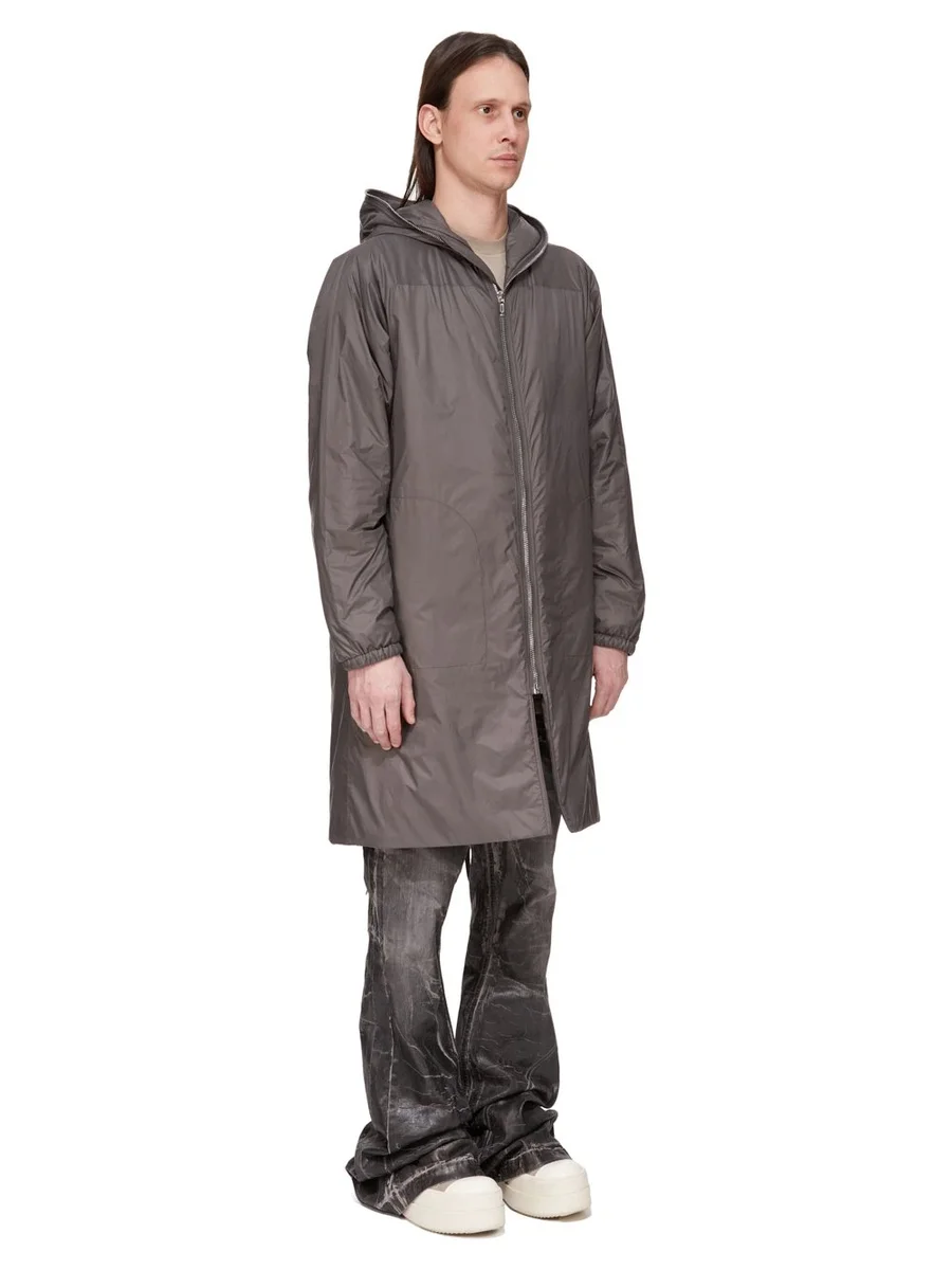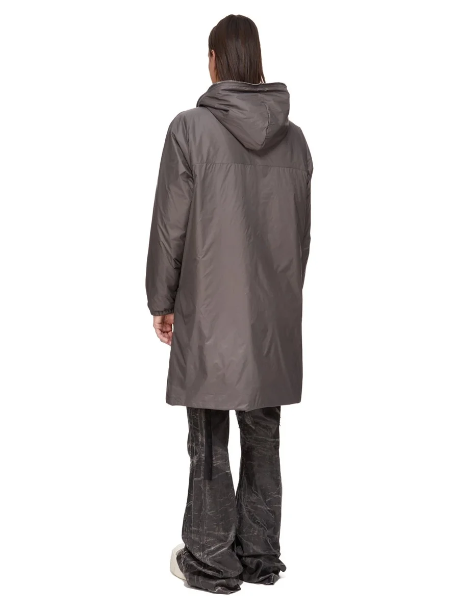 THIS SEALED WINDBREAKER COAT IS KNEE LENGTH WITH LONG SLEEVES. IT FEATURES A CENTRE FRONT ZIPPER THAT RUNS UP AND AROUND THE HOOD, SO THAT IT CAN CLOSE COMPLETELY OVER THE FACE. IT HAS TWO LARGE SIDE FRONT POCKETS WITH ROUNDED TOPSTITCHING AND VISIBLE SNAP CLOSURE, SIGNATURE CENTRE FRONT SEAM AND ELASTICIZED CUFF AND HEM. THIS VERSION IS PADDED AND HAS INTERNAL SNAP POCKETS.