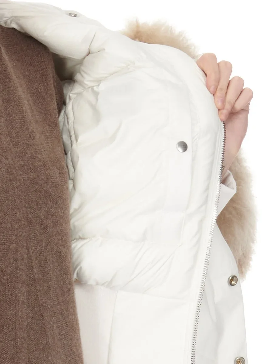 THIS LIGHTWEIGHT COTTON NYLON MATERIAL HAS A SOFT HAND FEEL. IT IS USED IN COMBINATION WITH A LONG HAIR CURLY GENUINE SHEARLING.