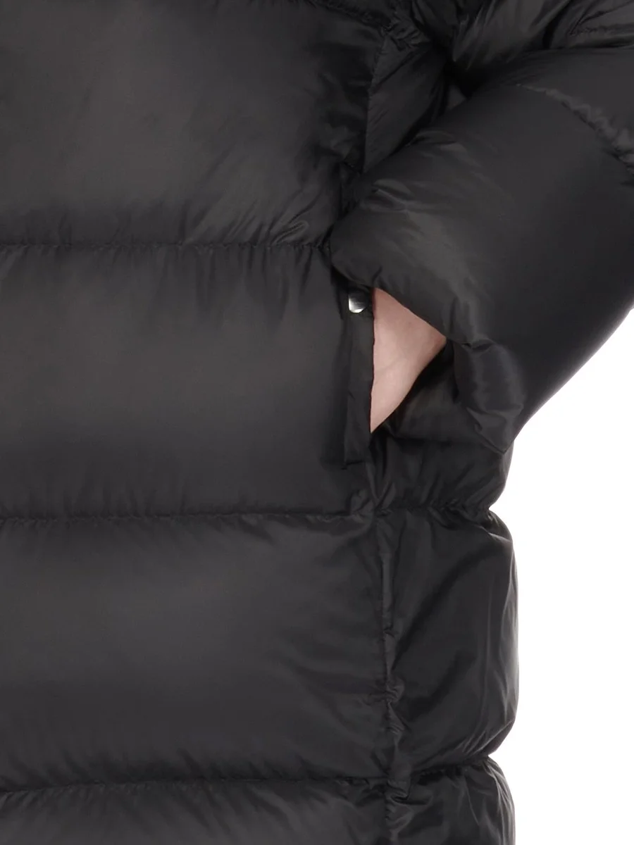 THIS HOODED CYCLOPIC COAT IS MID-THIGH LENGTH WITH A CENTRE FRONT ZIPPER AND A HIGH TURTLE-NECK COLLAR. IT IS A PADDED DUVET QUILTED WITH HORIZONTAL STITCHING LINES AND HAS SIDE FRONT WELT POCKETS WITH SNAPS. IT HAS A LARGE HOOD WITH A CENTRE ZIPPER THAT CAN BE WORN OPEN TO CREATE A LARGE COLLAR OVER THE SHOULDERS. IT FEATURES A SIGNATURE COTTON WEBBING STRAP WITH RIVET DETAIL ON THE BACK YOKE. IT HAS TWO INSIDE POCKETS WITH SNAPS AND THE MONCLER +RICK OWENS EMBROIDERED LOGO PATCH ON THE UPPER LEFT ARM.