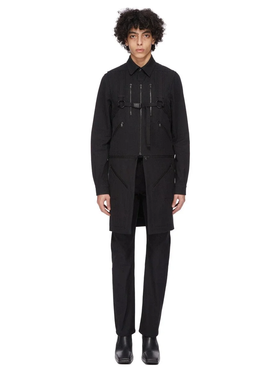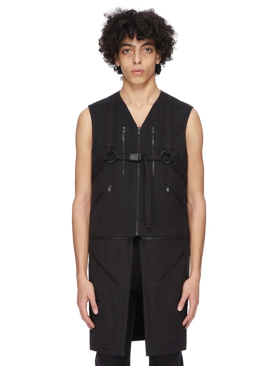 THIS BLIXA UTILITY VEST IS KNEE-LENGTH AND SLEEVELESS. IT HAS A V NECK AND FRONT OPENING THAT ZIPS TO THE WAIST, AND SECURES AT THE CHEST, WITH A QUICK RELEASE BUCKLE ON AN ADJUSTABLE WEBBING STRAP. IT HAS TWO FOG UTILITY POCKETS WITH DIAGONAL ZIPPERS ON THE FRONT THIGHS, AND A ZIPPER RUNNING AROUND THE WAIST, ALLOWING THE BOTTOM SECTION TO BE STYLED HANGING, OR COMPLETELY REMOVED, TO CREATE A HIP LENGTH VEST. THIS UPDATED VERSION OF LAST SEASON’S UTILITY VEST HAS ZIP POCKETS AND TWO LARGE METAL ‘COCK’ RINGS