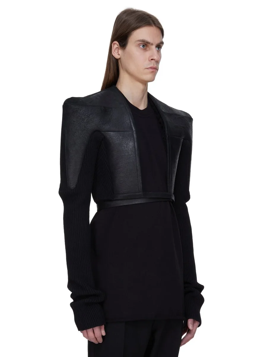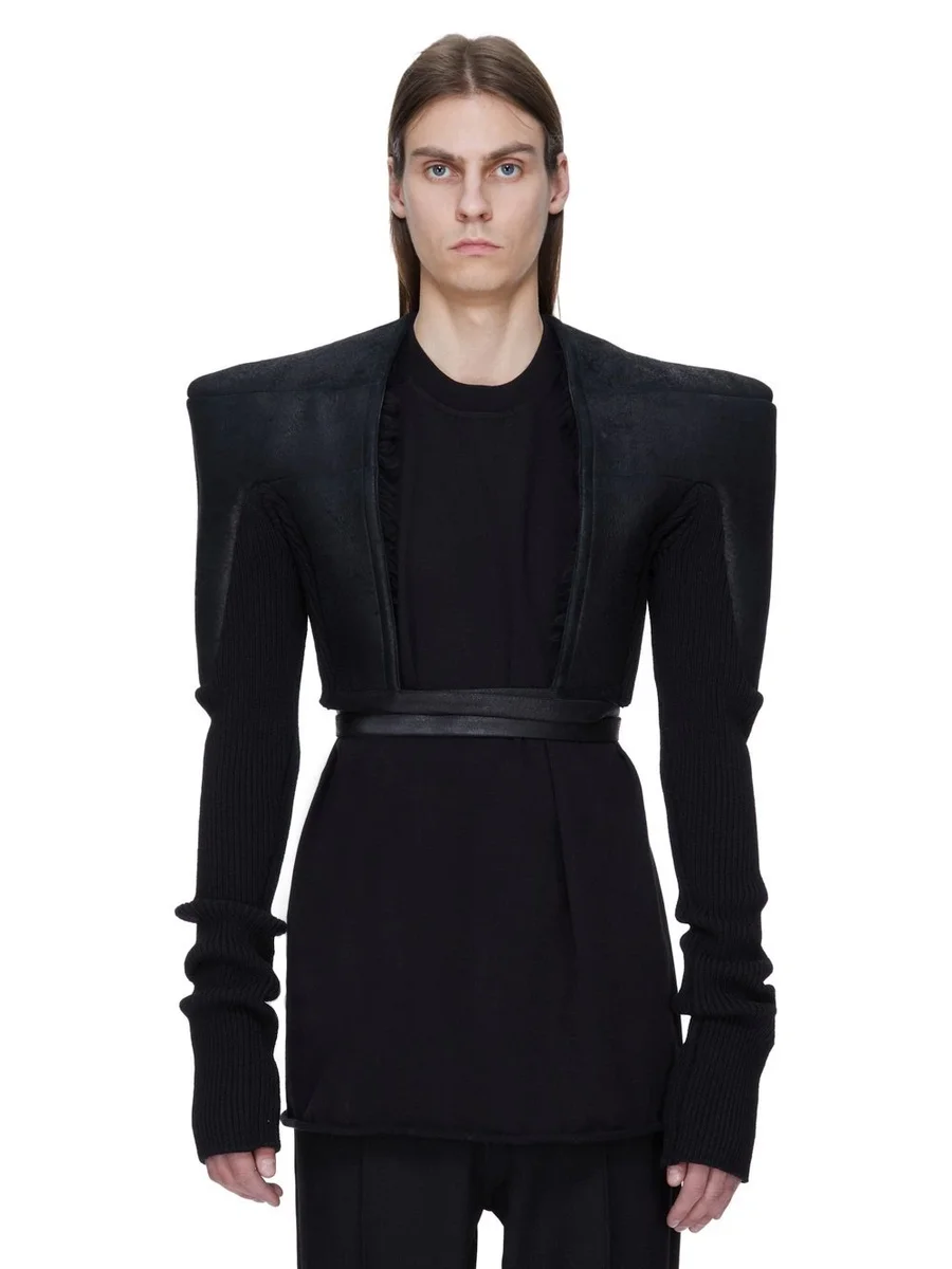 THIS TIGHT JKT IS WAIST LENGTH. IT IS CLOSE-FITTING, WITH LONG, RIB KNIT SLEEVES, AND AN OPEN FRONT THAT SECURES WITH A LONG TIE THAT THEN WRAPS AROUND THE WAIST. IT FEATURES STRUCTURED, WIDE TATLIN SHOULDERS WITH A GIRDERED SHOULDER SEAM, AND YOKE THAT IS HORIZONTAL ACROSS THE CHEST AND DESCENDS DOWN THE ARM, TO FINISH IN A BLUNT POINT AT THE ELBOW.