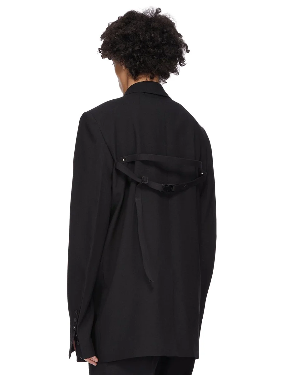 THIS CONCORDIAN JKT IS BELOW-HIP LENGTH WITH LONG SLEEVES. IT HAS CLASSIC SLOPING SHOULDERS WITH LEVEL SHOULDER SNAPS AND A SLIM LAPEL, WITH DOUBLE BUTTON CLOSURE AND TWO LOWER SIDE FRONT JET POCKETS. IT HAS 5 BUTTON CUFFS, A BACK VENT AND FEATURES AN ADJUSTABLE, THIN COTTON WEBBING DISCO STRAP, WITH CLIP, ACROSS THE BACK YOKE.IT IS FULLY LINED AND HAS TWO INTERNAL BUTTONED POCKETS.