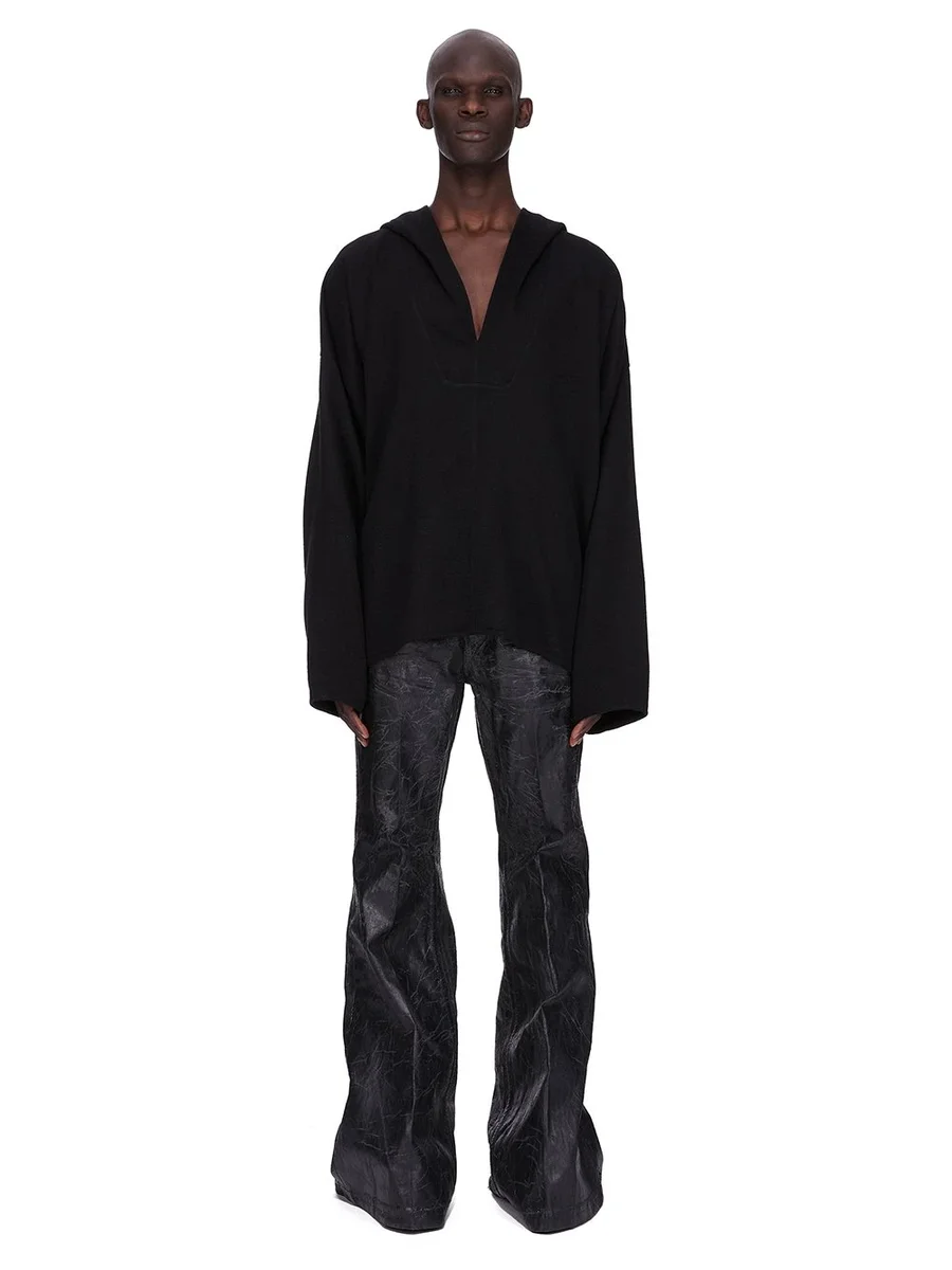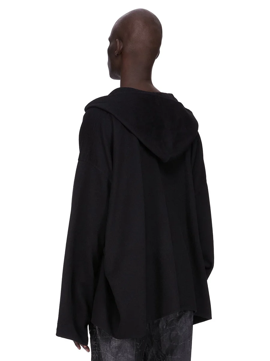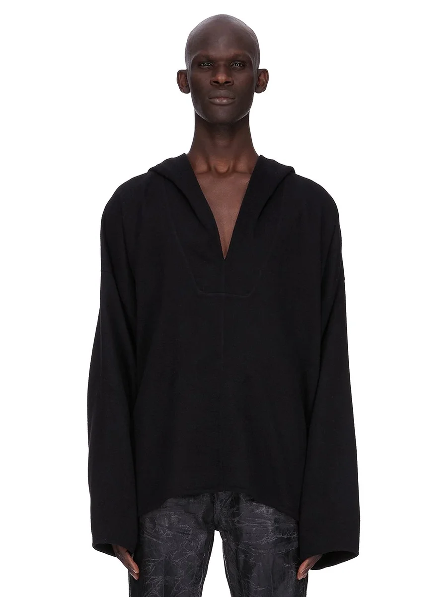 THIS LS KAFTAN HIP IS HIP LENGTH WITH LONG, WIDE SLEEVES. IT HAS A LARGE HOOD WITH A V NECK AND SEAM RUNNING DOWN THE CENTRE FRONT AND BACK. IT IS A VOLUMINOUS KAFTAN SHAPE, WITH A WIDE SHOULDER FALLING INTO A DROPPED ARMHOLE.