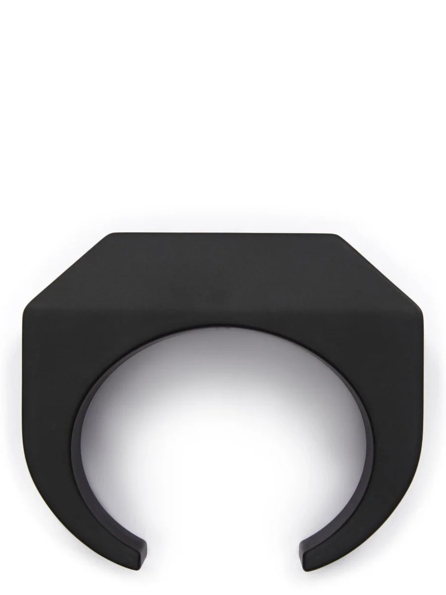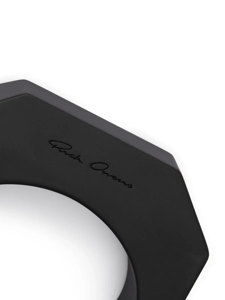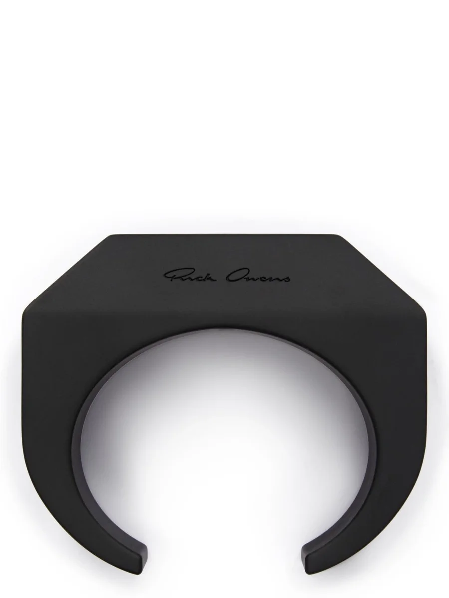 THIS PERFORMA BRACELET IS A SOLID METAL CUFF WITH BEVELED EDGES. IT HAS THE RICK OWENS LOGO ENGRAVED IN THE SIDE FACE. THIS IS THE DARK BRONZE VERSION.