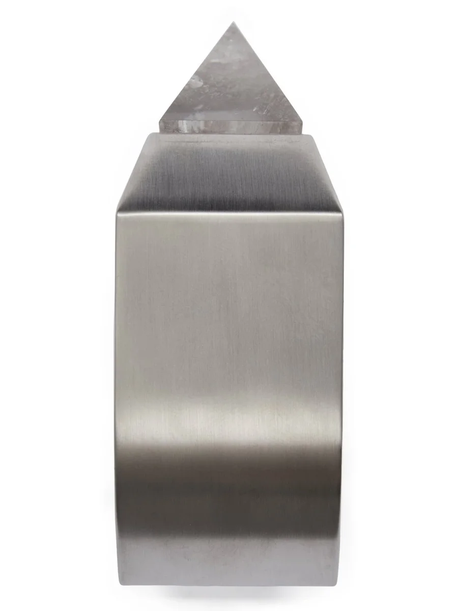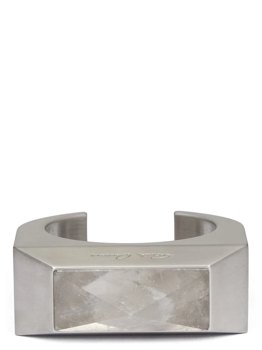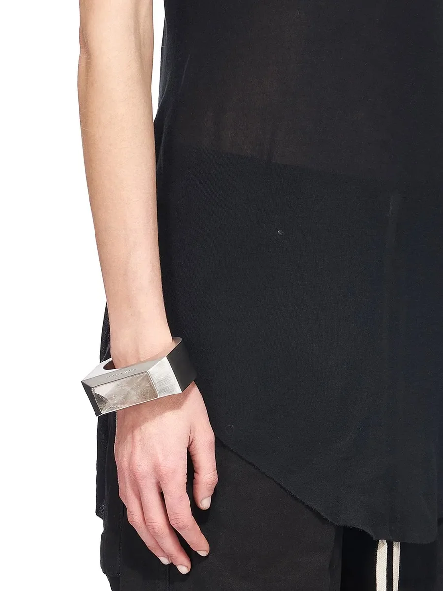 THIS CRYSTAL PYRAMID BRACELET IS A LARGE RIGID METAL CUFF WITH BEVELED EDGES. IT IS ORNAMENTED WITH A LARGE PYRAMID SHAPED ROCK CRYSTAL. IT HAS THE RICK OWENS LOGO ENGRAVED IN THE SIDE FACE.
