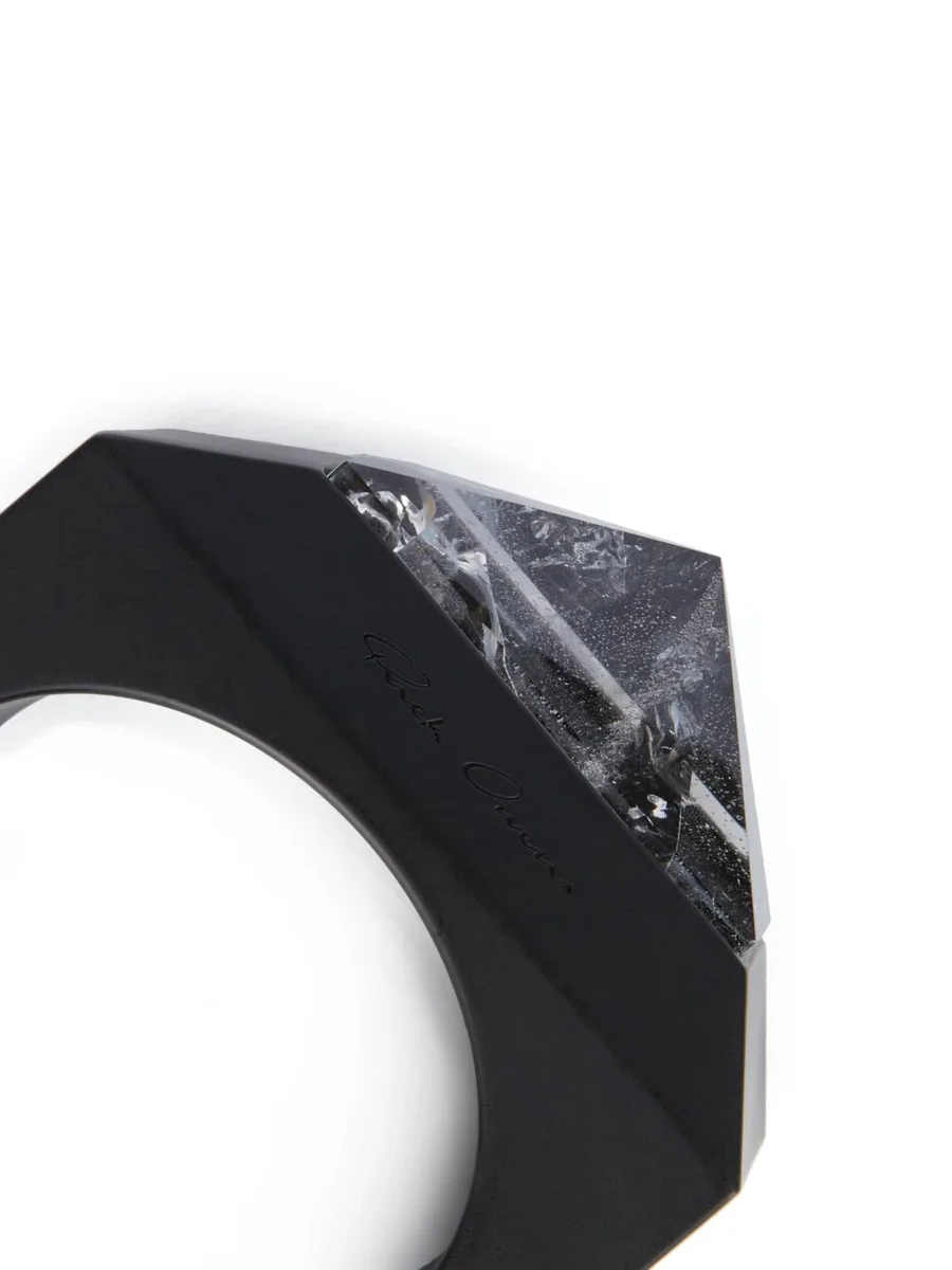 THIS CRYSTAL PYRAMID BRACELET IS A LARGE RIGID METAL CUFF WITH BEVELED EDGES. IT IS ORNAMENTED WITH A LARGE PYRAMID SHAPED ROCK CRYSTAL. IT HAS THE RICK OWENS LOGO ENGRAVED IN THE SIDE FACE.