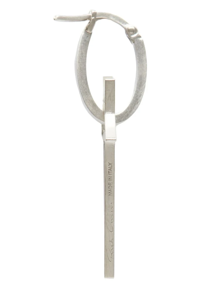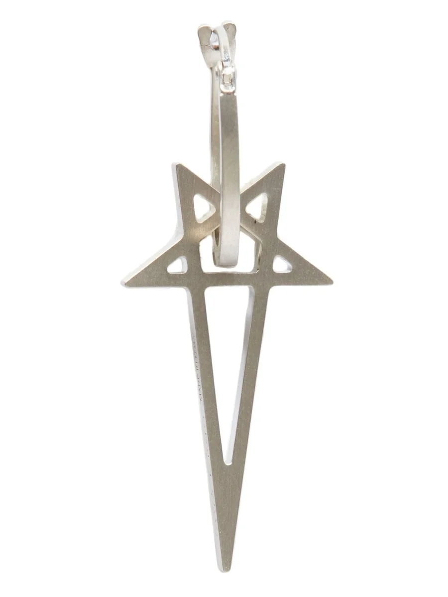 THIS PENTAGRAM EARRING HAS A SMALL PENTAGRAM HANGING FROM AN OVAL SHAPED EARRING. IT HAS THE RICK OWENS LOGO ENGRAVED ON THE SIDE FACE.