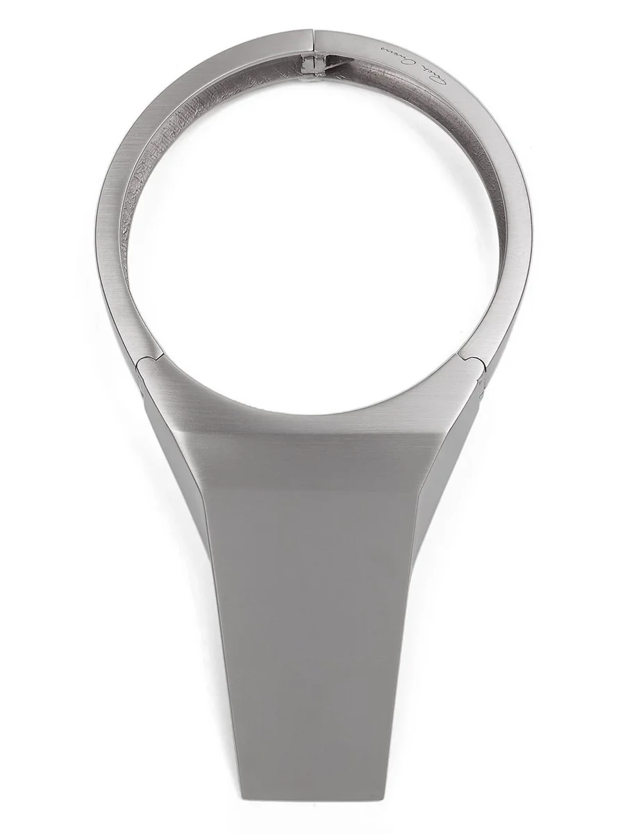 THISPLAIN TRUNK NECKLACEIS A RIGID METAL CUFF WITH ONE ENLONGATED BEVELED EDGES.IT HAS A HOLLOW INTERIOR, A MAGNETIC CLASP SIDE CLOSURE AND THE RICK OWENS LOGO ENGRAVED IN THE SIDE FACE.