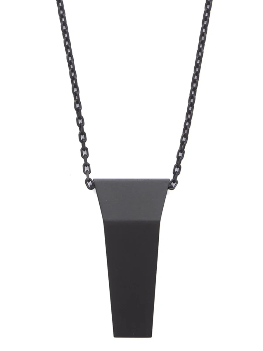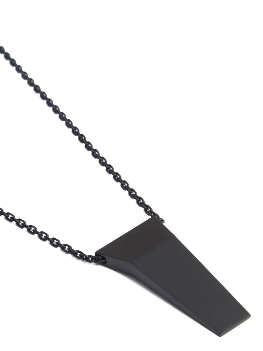 THIS TRUNK CHARM NECKLACE HAS A SMALL GEOMETRIC TRUNK SHAPED CHARM WITH BEVELED EDGES HANGING FROM A CHAIN NECKLACE. IT HAS THE RICK OWENS LOGO ENGRAVED ON THE BACK.