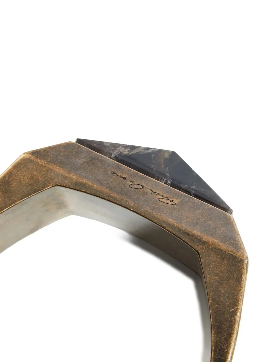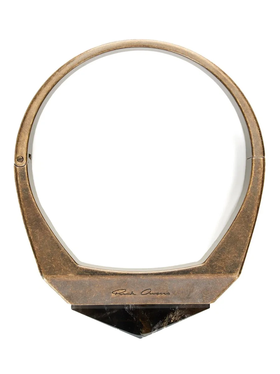 THIS CRYSTAL BEVELED CHOKER NECKLACE IS A SOLID METAL CHOKER WITH BEVELED EDGES ORNAMENTED WITH A SMOKEY QUARTZ CRYSTAL STONE. IT HAS A MAGNET CLASP CLOSURE IN THE BACK AND THE RICK OWENS LOGO ENGRAVED IN THE SIDE FACE.