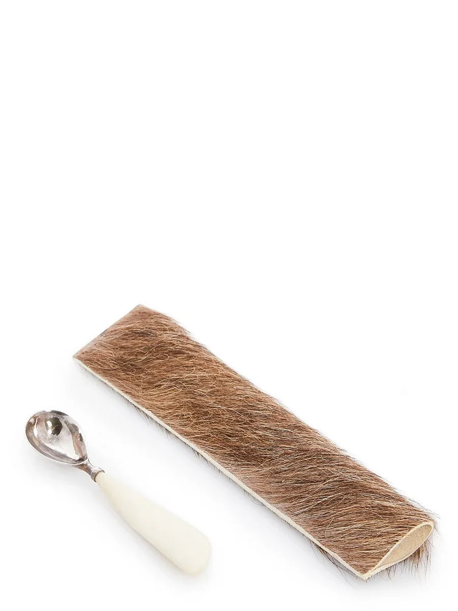 THIS TEA SPOON FEATURES A ROUND SHAPE STERLING SILVER UPPER PART AND AN OX BONE LOWER PART. IT ALSO COME WITH A CAMEL FUR COVER AND A WOODEN BOX.