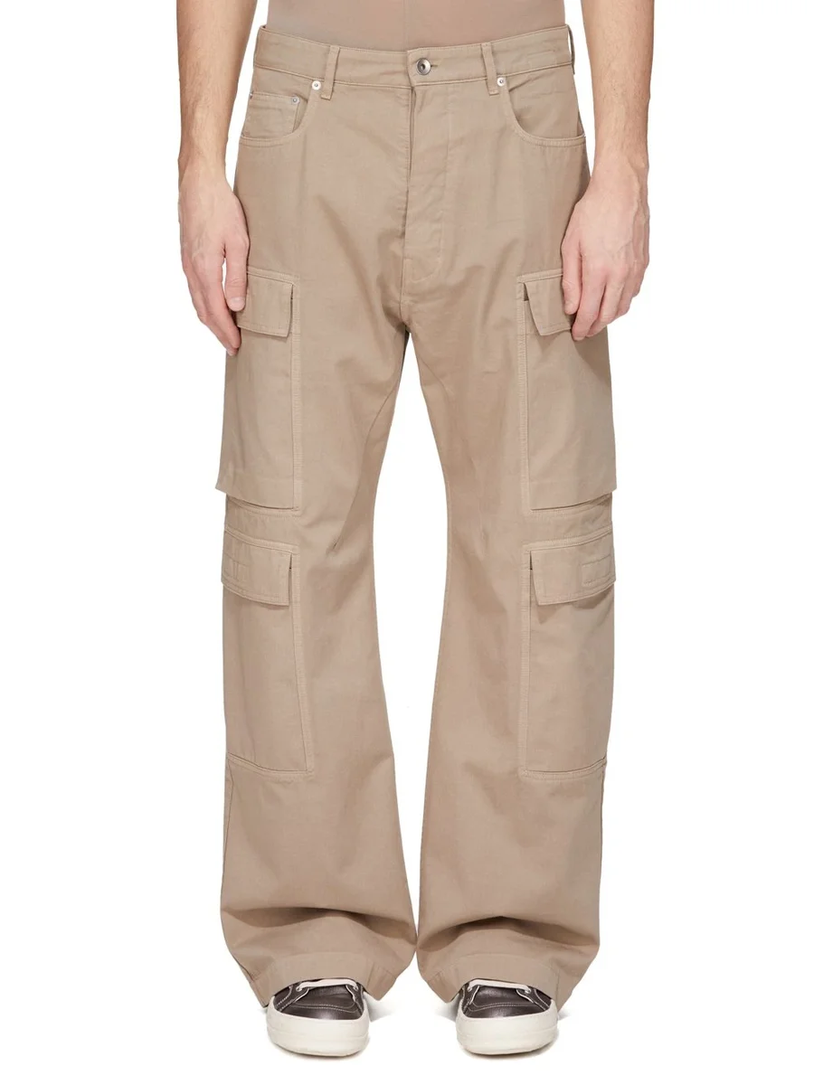 THESE DOUBLE CARGO JEANS ARE A FULL LENGTH 5-POCKET JEAN WITH A LOW-RISE AND A LOOSE FIT. THEY HAVE A CONCEALED SILVER ZIPPER FLY WITH TOP BUTTON, BELT LOOPS AND POCKET RIVETS AND THEY FEATURE TWO BEVELED CARGO POCKETS ON THE THIGH, WITH TWO SQUARE CARGO POCKETS BELOW AND TWO SQUARE BACK POCKETS. THEY ALL HAVE FLAPS AND TOPSTITCHING.