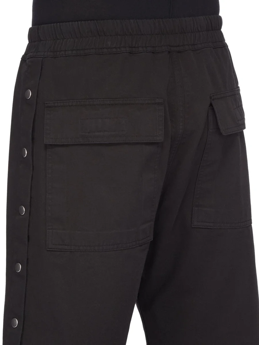 THESE PUSHER SHORTS ARE KNEE LENGTH WITH AN AMPLE LEG AND A SLIGHTLY DROPPED CROTCH. THEY HAVE AN ELASTICIZED WAISTBAND WITH DRAWSTRING, SIDE FRONT JET POCKETS AND SQUARE BACK POCKETS WITH TOPSTITCHING. THEY FEATURE VISIBLE SNAP CLOSURES RUNNING DOWN THE OUTER LEG ALLOWING THEM TO BE UNSNAPPED AND WORN OPEN.