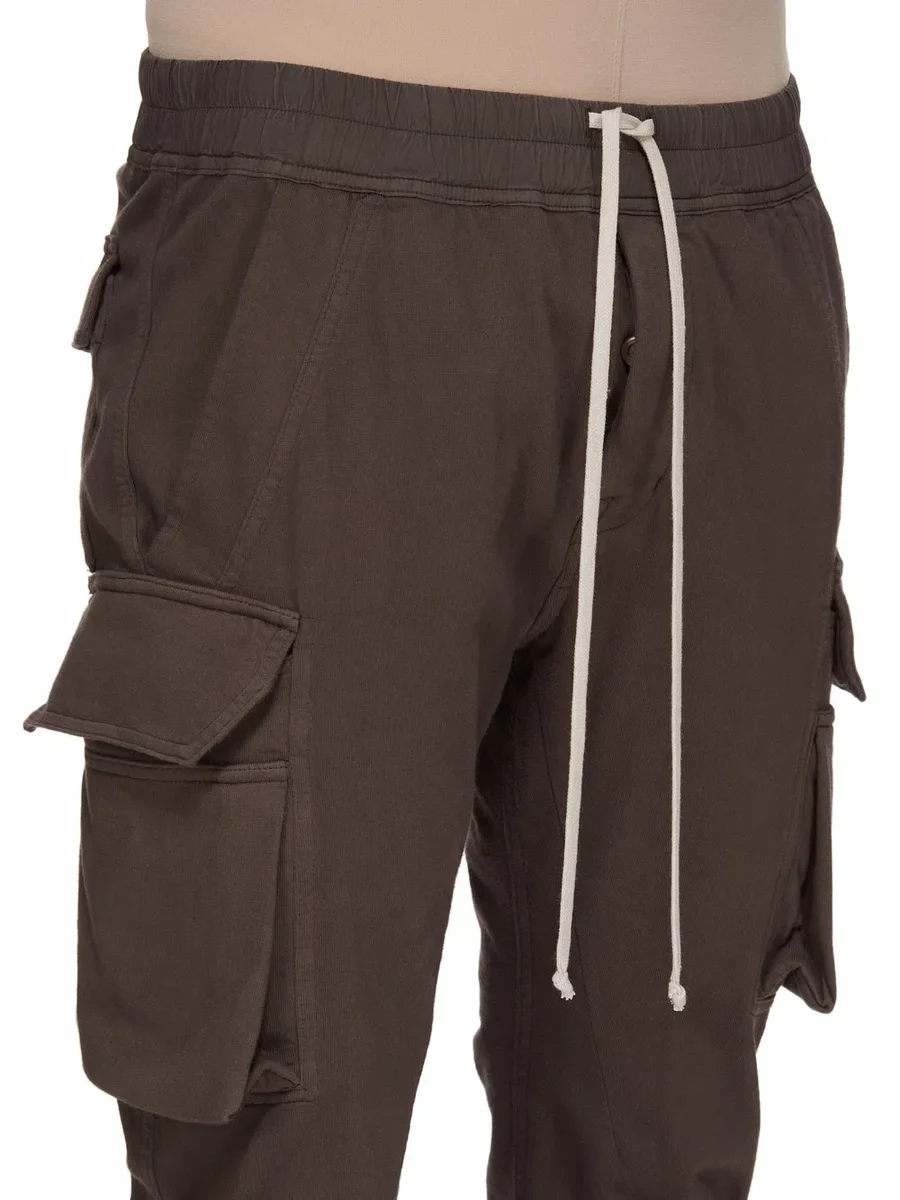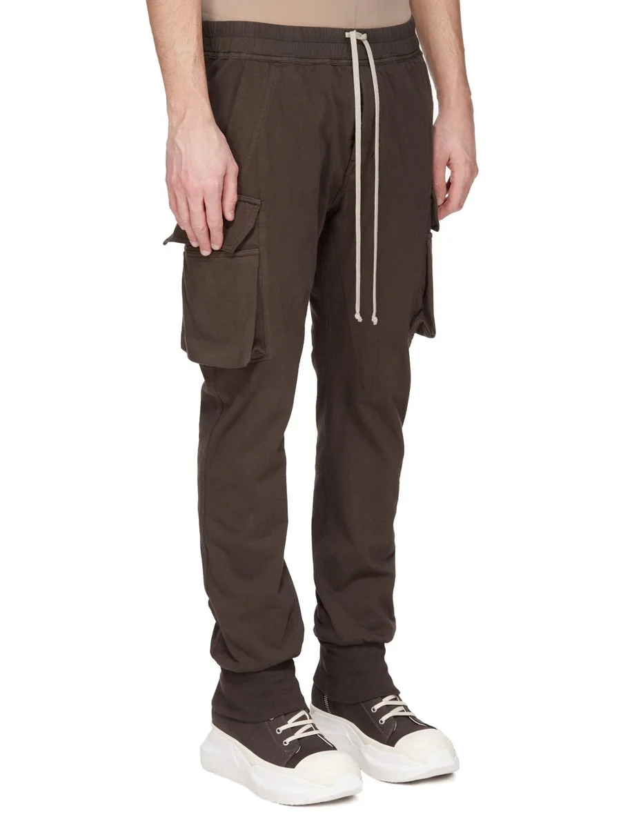 THESE MASTODON CUT PANTS ARE FULL LENGTH WITH A SLIM FIT. THEY HAVE AN ELASTICIZED WAISTBAND WITH DRAWSTRING AND ELASTICIZED CUFFS. THEY FEATURE TWO SIDE WELT POCKETS, TWO ZIPPERED CARGO POCKETS WITH BEVELED FLAPS ON THE OUTER THIGH, AND BACK PATCH POCKETS WITH FLAPS AND TOPSTITCHING.