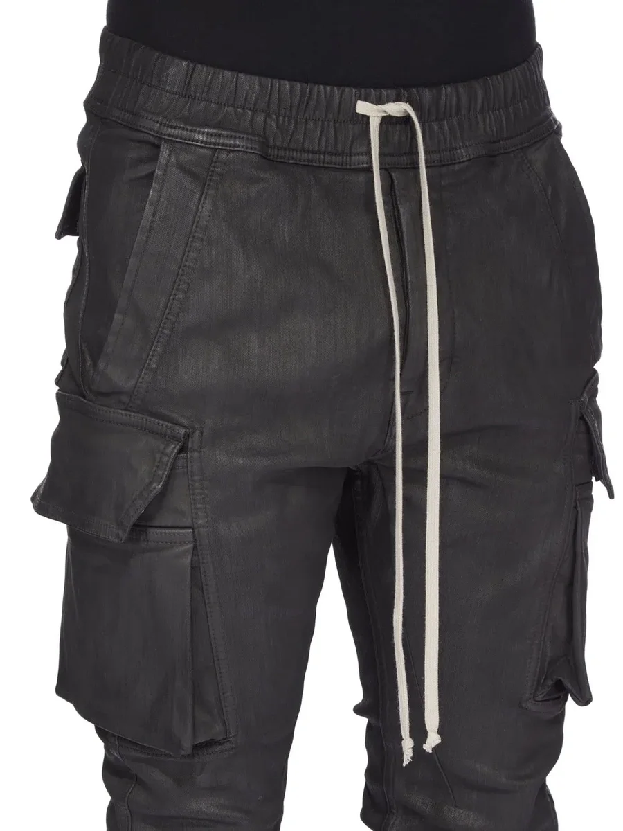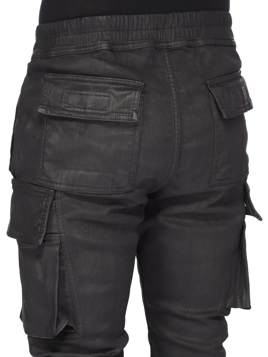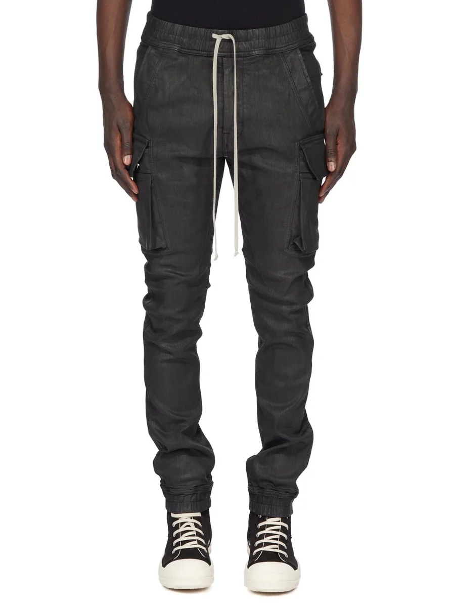 THESE MASTODON CUT PANTS ARE FULL LENGTH WITH A SLIM FIT. THEY HAVE AN ELASTICIZED WAISTBAND WITH DRAWSTRING AND ELASTICIZED CUFFS. THEY FEATURE TWO SIDE WELT POCKETS, TWO ZIPPERED CARGO POCKETS WITH BEVELED FLAPS ON THE OUTER THIGH, AND BACK PATCH POCKETS WITH FLAPS AND TOPSTITCHING.