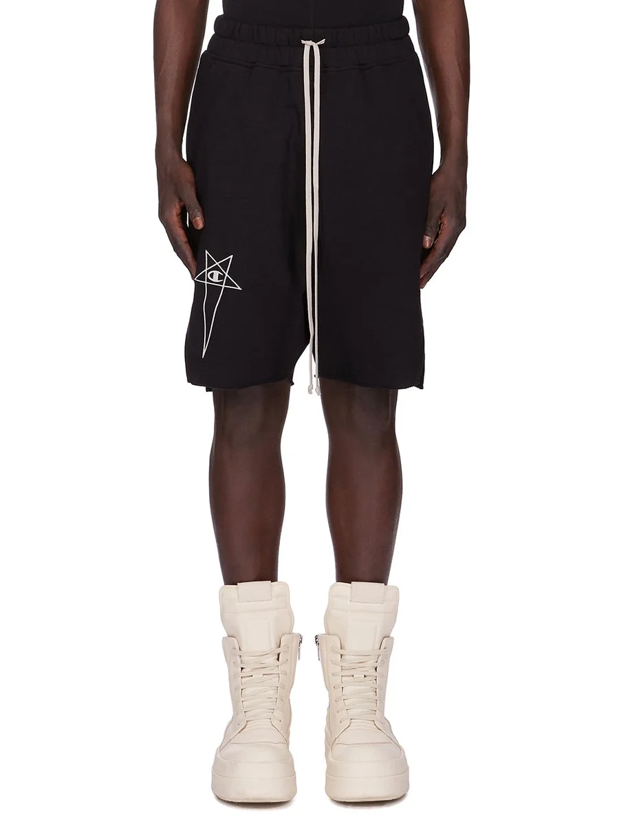 THEY HAVE A 3D EMBROIDERED SIGNATURE CHAMPION X RICK OWENS PENTAGRAM LOGO ACROSS FRONT AND A CHAMPION LOGO ON THE BACK HIP.