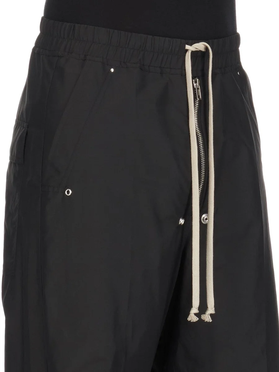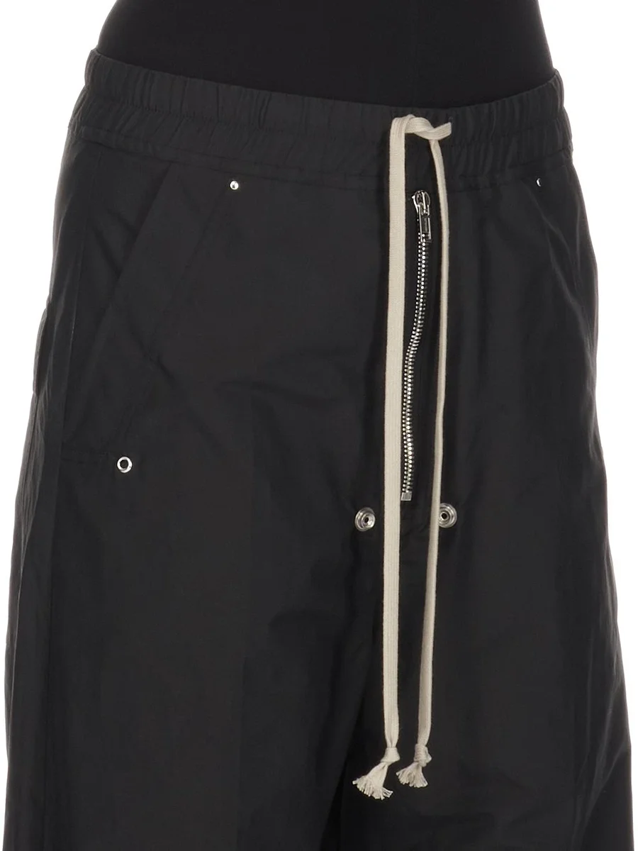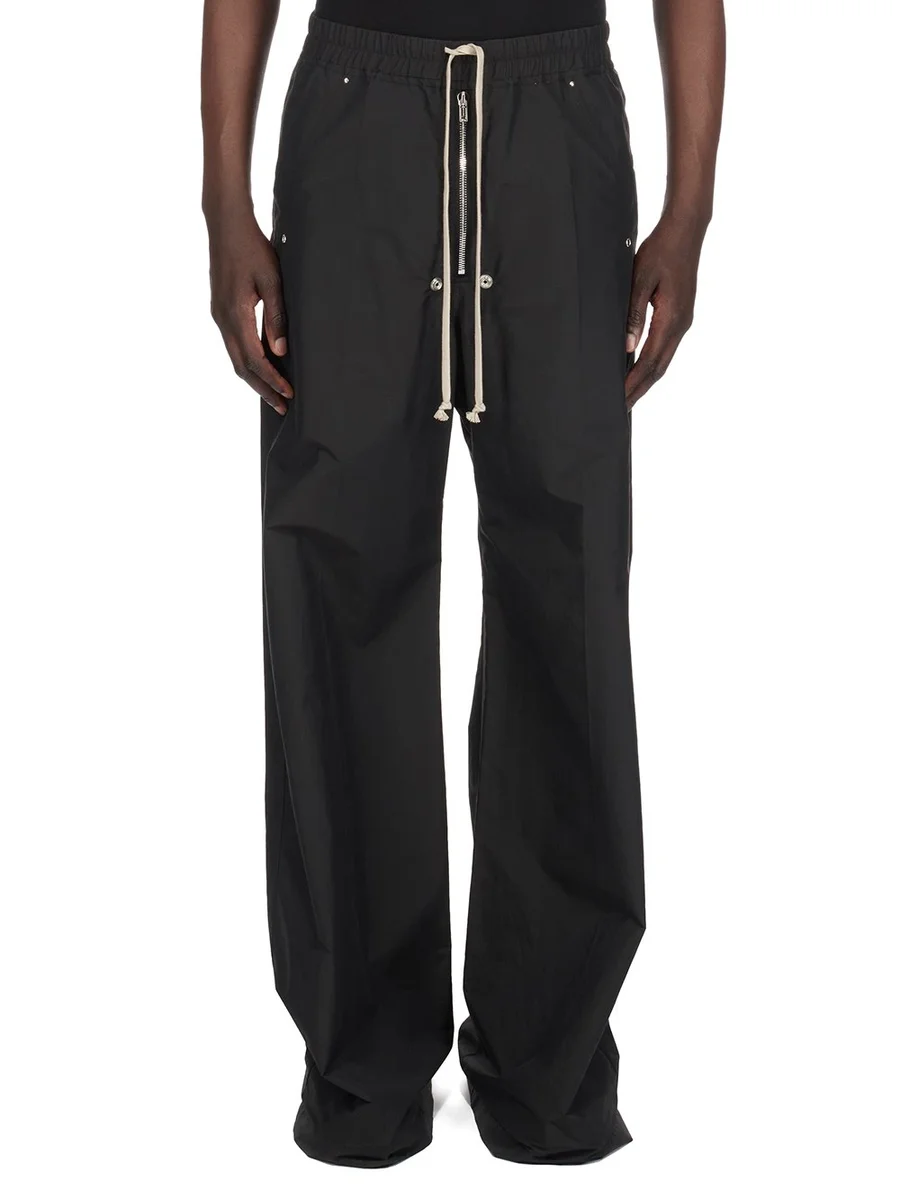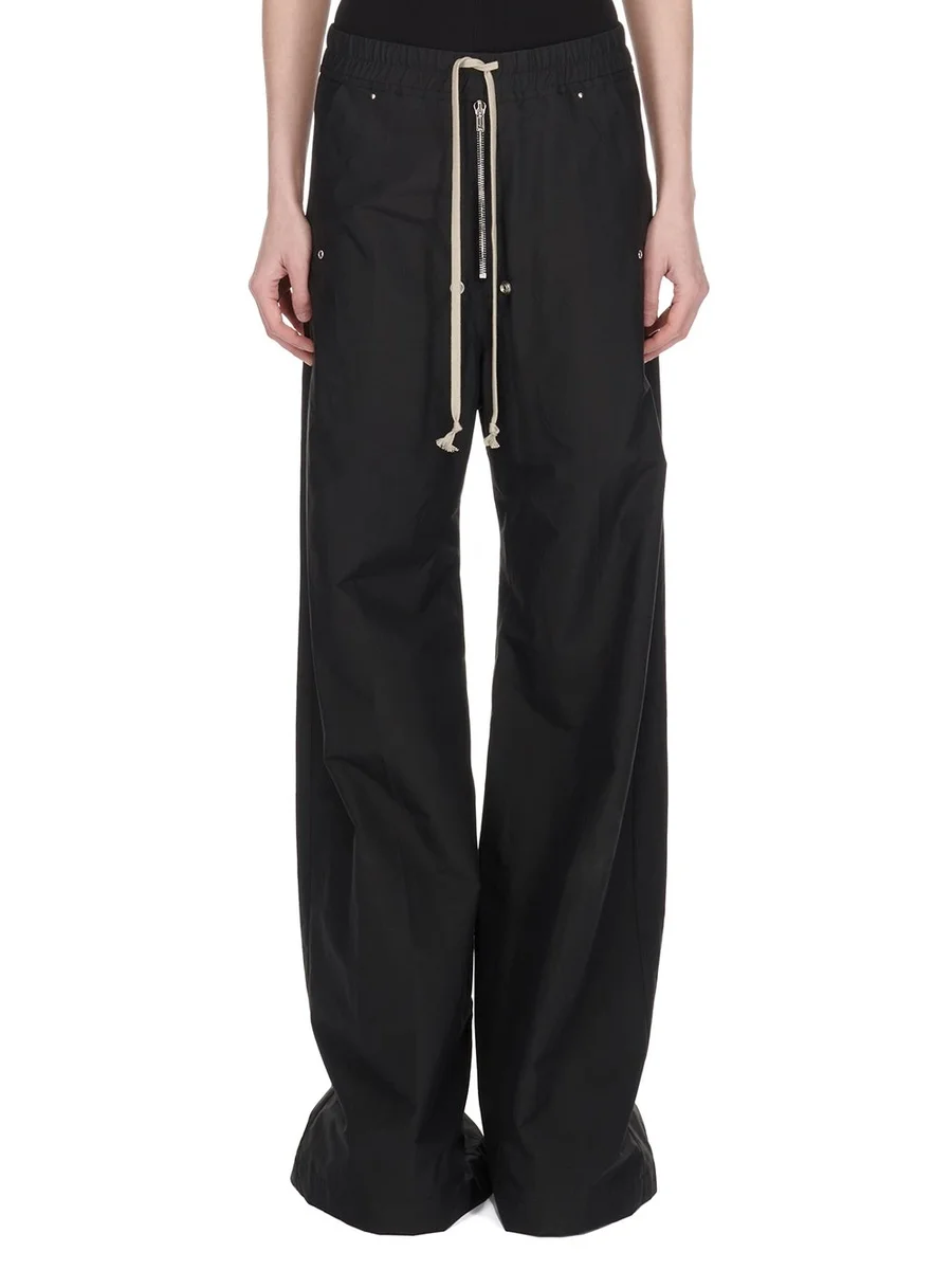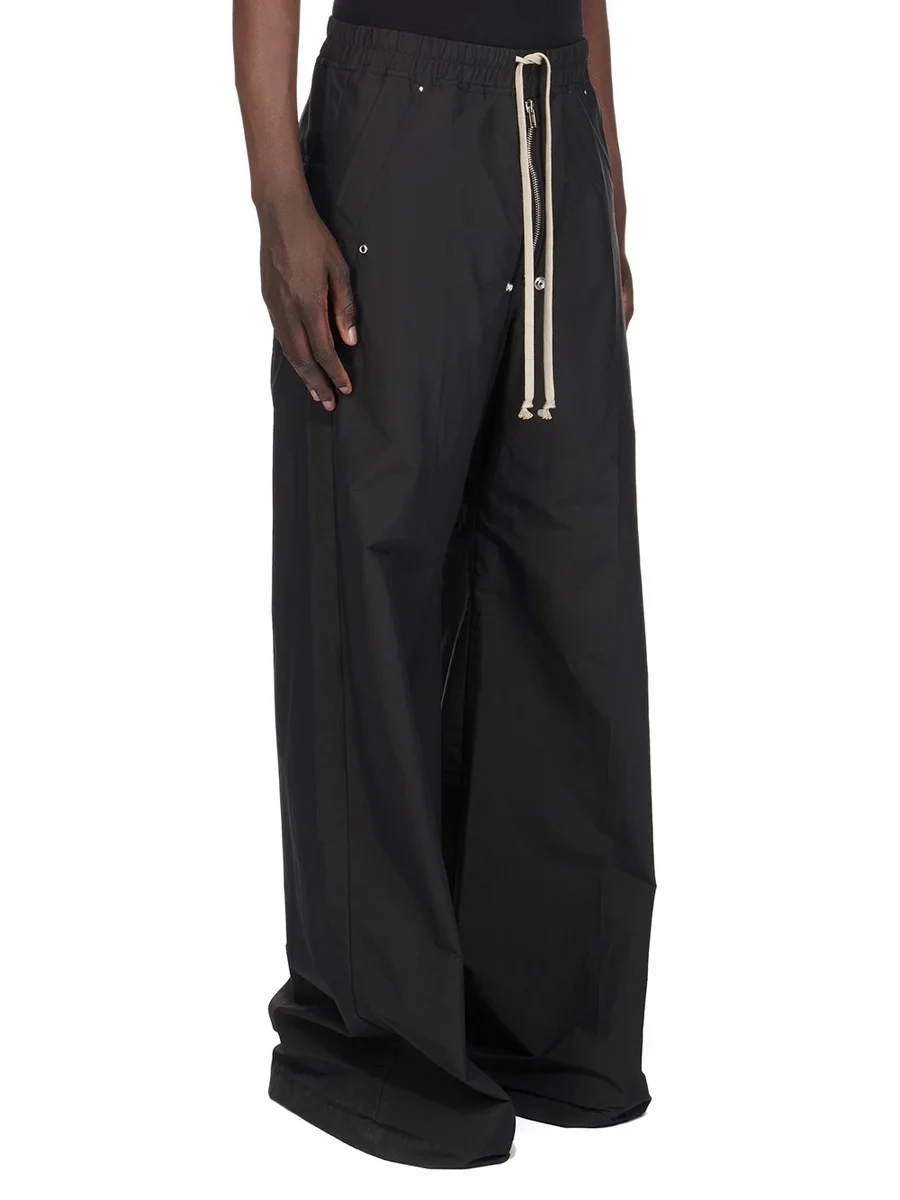 THESE WIDE BELA PANTS ARE FULL-LENGTH WITH A LOW CROTCH AND A WIDE LEG. THEY FEATURE AN ELASTICIZED WAISTBAND WITH DRAWSTRING AND A BELA EXPOSED CENTRE ZIPPER WITH TWO SNAP DETAIL AT BOTTOM. THEY HAVE SIDE POCKETS WITH EYELET AND RIVET DETAIL AND BACK POCKETS WITH FLAPS. IT HAS THE MONCLER +RICK OWENS EMBROIDERED LOGO PATCH ON THE REAR LEFT HIP.