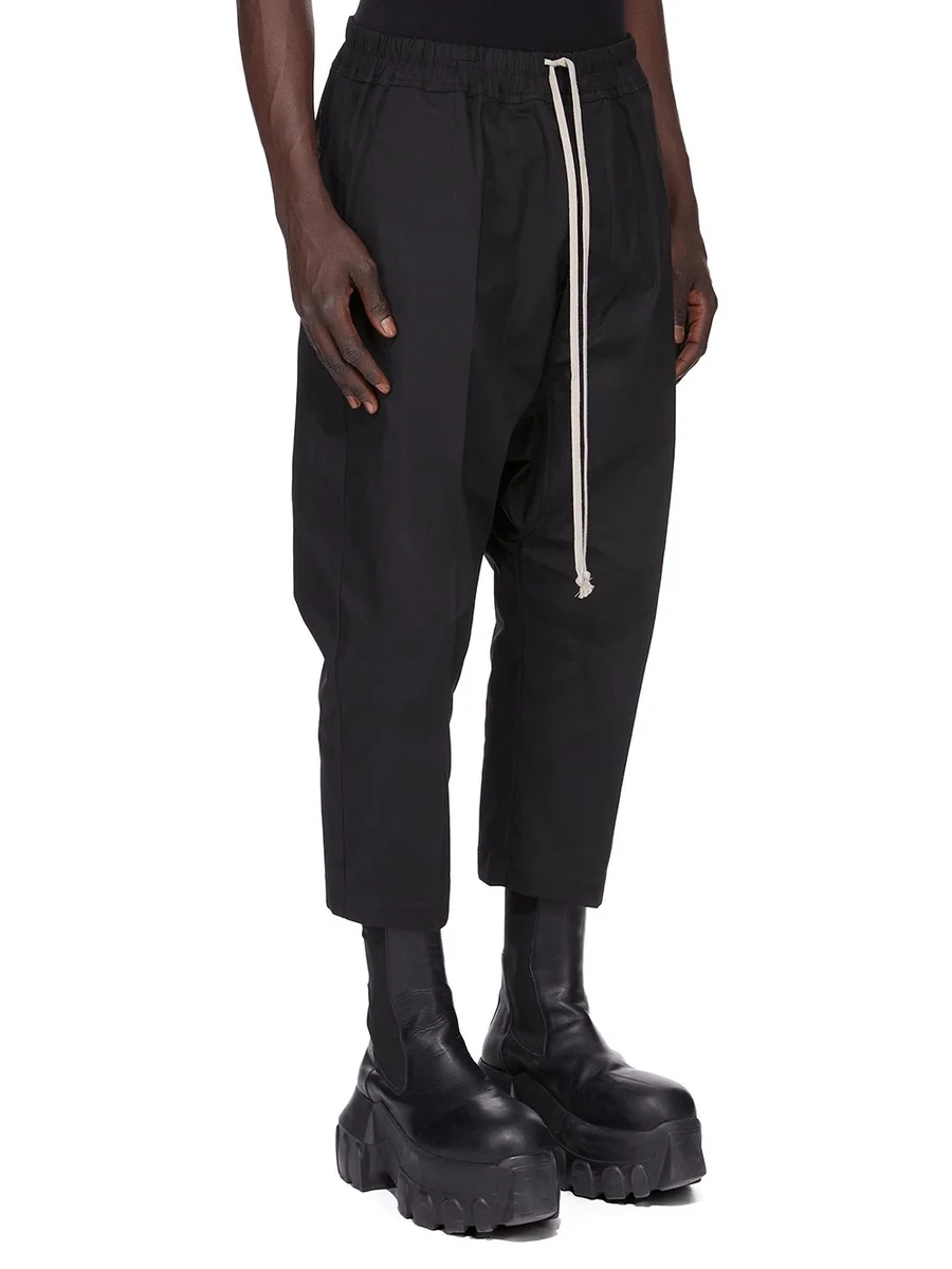 THESE DRAWSTRING CROPPED PANTS ARE ABOVE-ANKLE LENGTH WITH A DROPPED CROTCH. THEY HAVE AN ELASTICIZED WAISTBAND WITH DRAWSTRING, A CONCEALED FLY, AND PRESSED CREASES ON THE FRONT AND BACK LEG. THEY FEATURE TWO SIDE FRONT POCKETS AND TWO SQUARE BACK POCKETS WITH FLAPS AND TOPSTITCHING.