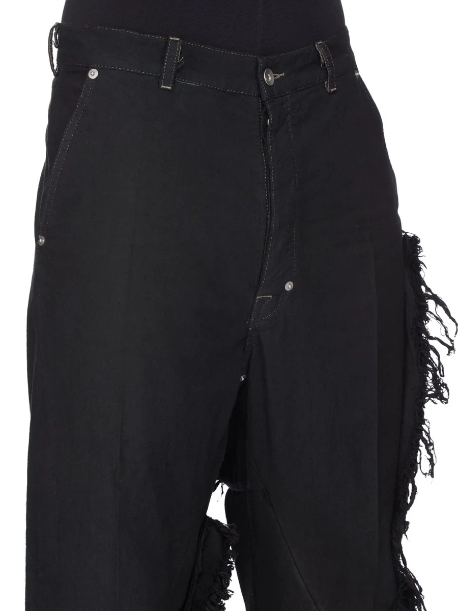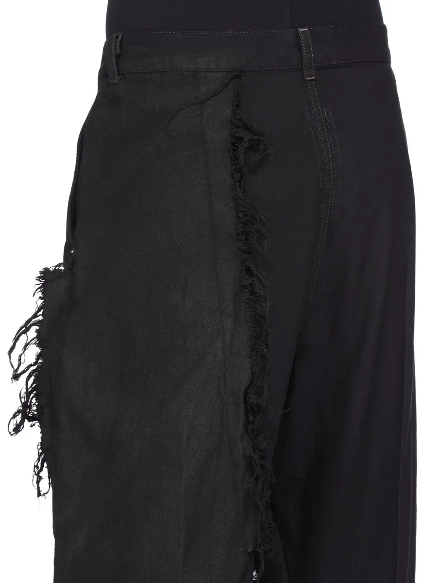 THESE JORIS TROUSERS ARE FLOOR LENGTH. THEY HAVE A CONCEALED BUTTON FLY WITH RIVET, BELT LOOPS AND SIDE WELT POCKETS WITH RIVET DETAIL. THEY FEATURE A DISTRESSED RAW EDGE ON THE INNER RIGHT LEG AND OUTER LEFT HIP IN CONTRAST FABRIC.