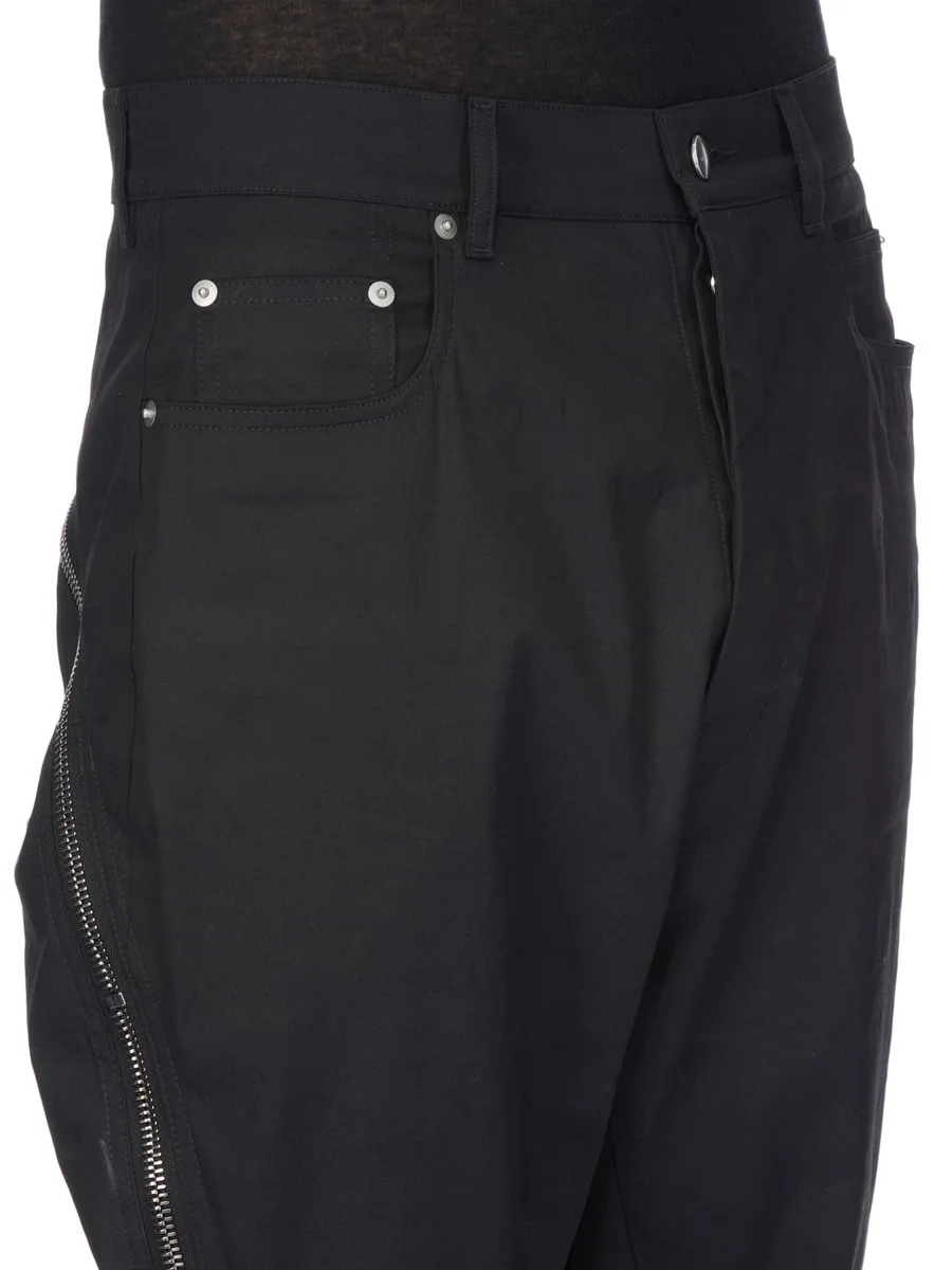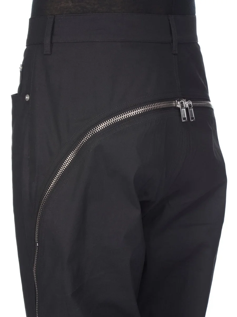 THIS BOLAN BANANA IS A HIGH WAISTED, SLIM FIT 5 POCKET JEAN WITH A FLOOR-LENGTH BOOT CUT. THEY HAVE A CONCEALED BUTTON FLY AND A WAISTBAND WITH CENTRE BUTTON, BELT LOOPS AND POCKET RIVETS AND BACK PATCH POCKETS WITH TOPSTITCHING. THEY FEATURE A LONG ZIPPER RUNNING FROM CENTRE BUTT, CURVING AROUND THE HIP TO THE HEM. IT CAN UNZIP AT BACK TO EXPOSE THE BUTT, AND ALSO ZIP UP FROM THE HEM TO EXPOSE AN INNER FLARED PANEL IN THE LEG.