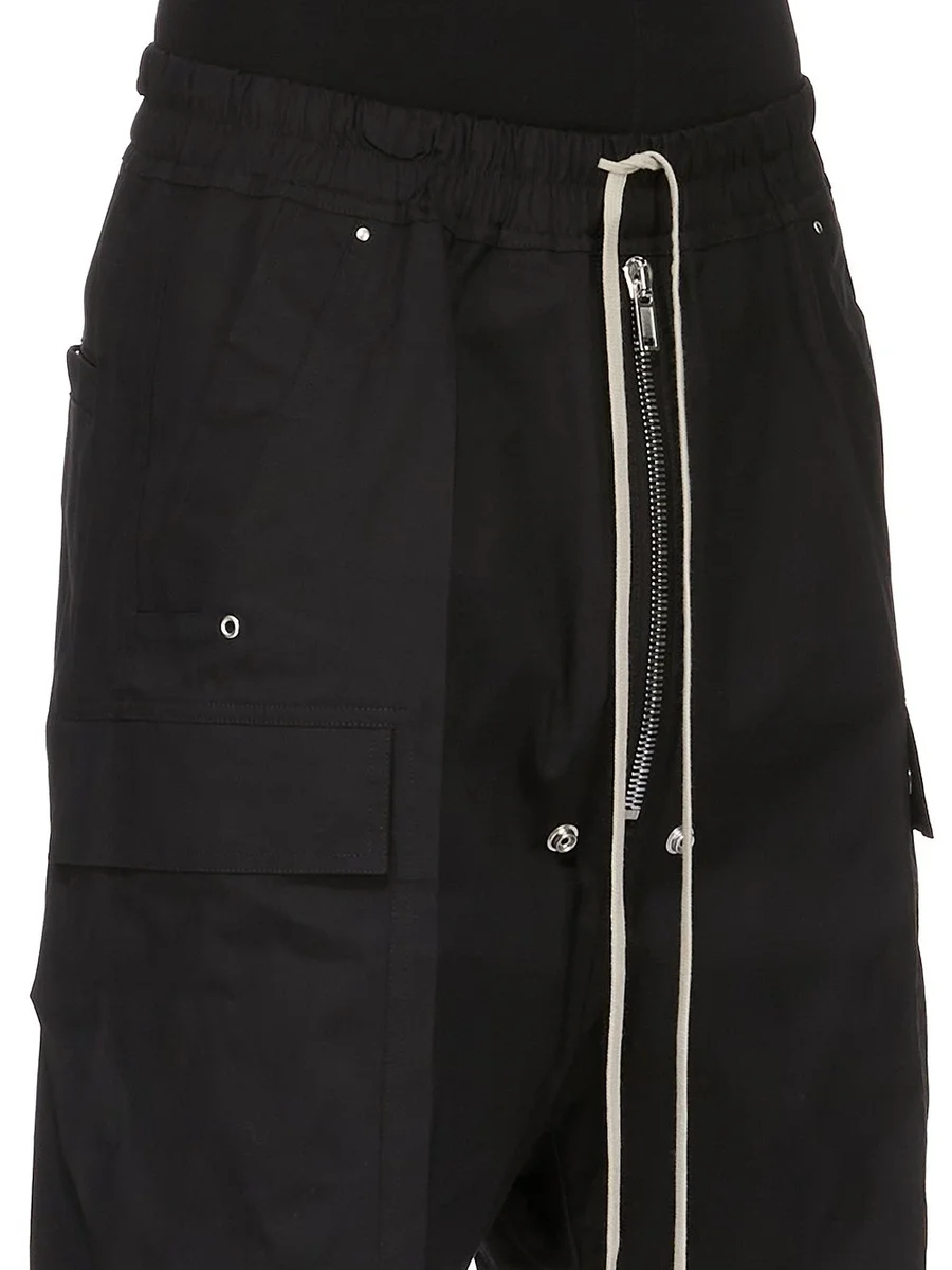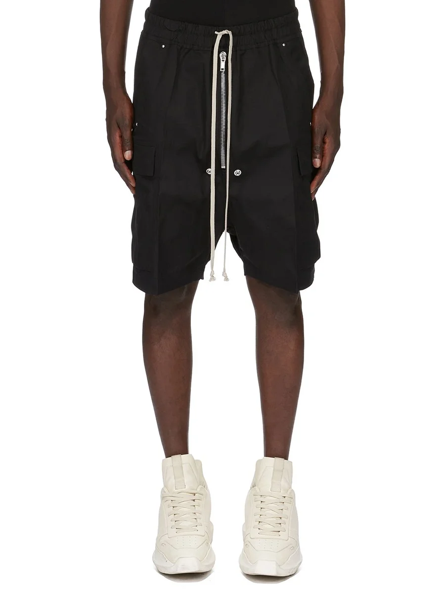 THESE CARGOBELA SHORTS ARE KNEE-LENGTH WITH A LOW CROTCH AND WIDE LEG. THEY FEATURE AN ELASTICIZED WAISTBAND WITH DRAWSTRING AND A BELA EXPOSED CENTER ZIPPER WITH TWO SNAP DETAIL AT BOTTOM. THEY FEATURE TWO BEVELED CARGO POCKETS ON THE SIDE LEG WITH TWO REAR WELT POCKETS, ALL WITH CONCEALED SNAPS AND TOPSTITCHING.