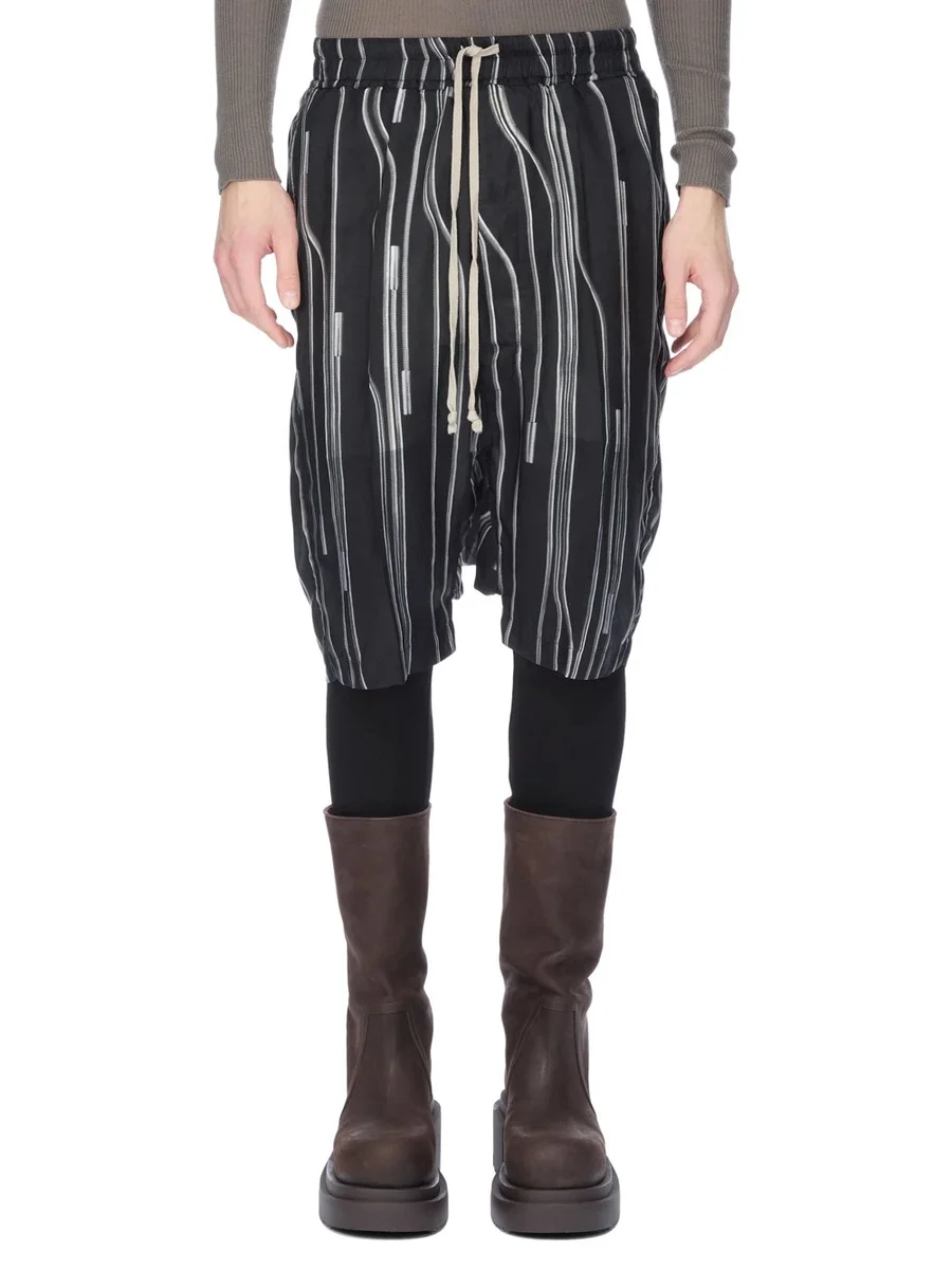 THESE RICK’S PODS ARE BELOW KNEE LENGTH SHORTS WITH A LOW DROPPED CROTCH. THEY HAVE AN ELASTICIZED WAISTBAND WITH DRAWSTRING, CONCEALED FLY, TWO SIDE POCKETS AND TWO SQUARE BACK POCKETS WITH FLAPS. THEY HAVE A ROUNDED PANEL BETWEEN THE LEGS AND DOUBLE TOPSTITCHING.