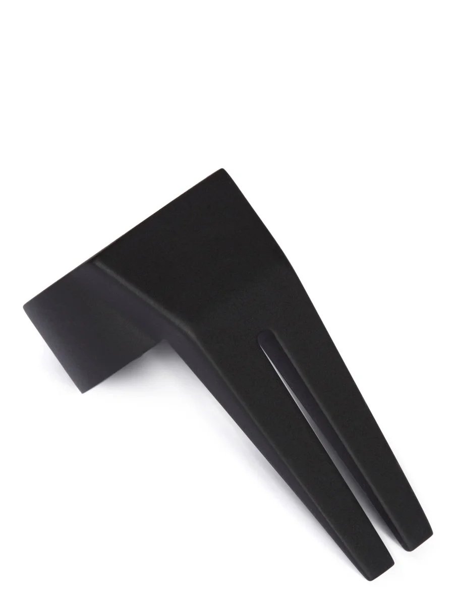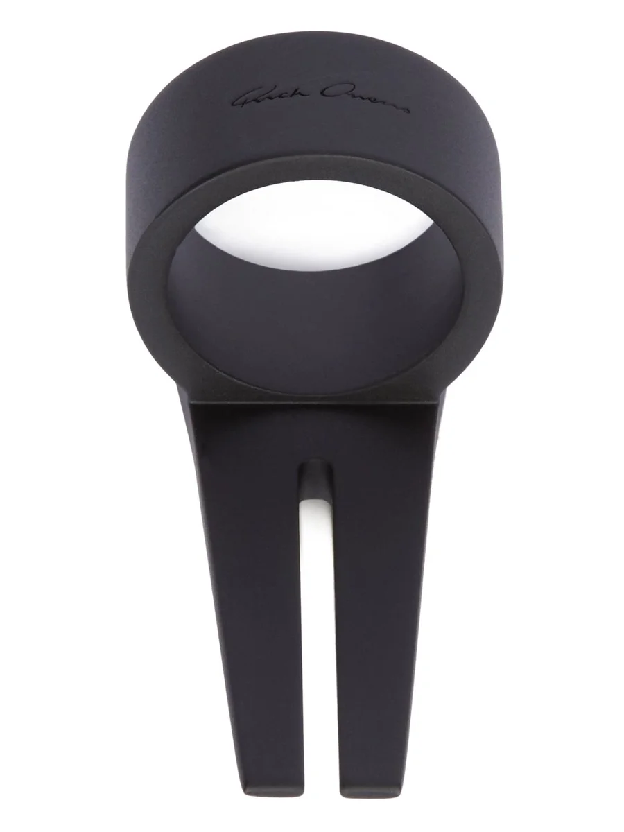 THIS OPEN TRUNK RING IS A THICK BAND WHICH EXTENDS INTO A GEOMETRIC TRUNK SHAPE WITH AN OPEN FACE CENTRE SLIT AND BEVELED EDGES AND THE RICK OWENS LOGO ENGRAVED ON THE BACK. THESE JEWELLERY PIECES ARE CRAFTED WITH THE INDIVIDUAL HANDWORK OF THE ARTISAN, MAKING EACH PIECE UNIQUE.