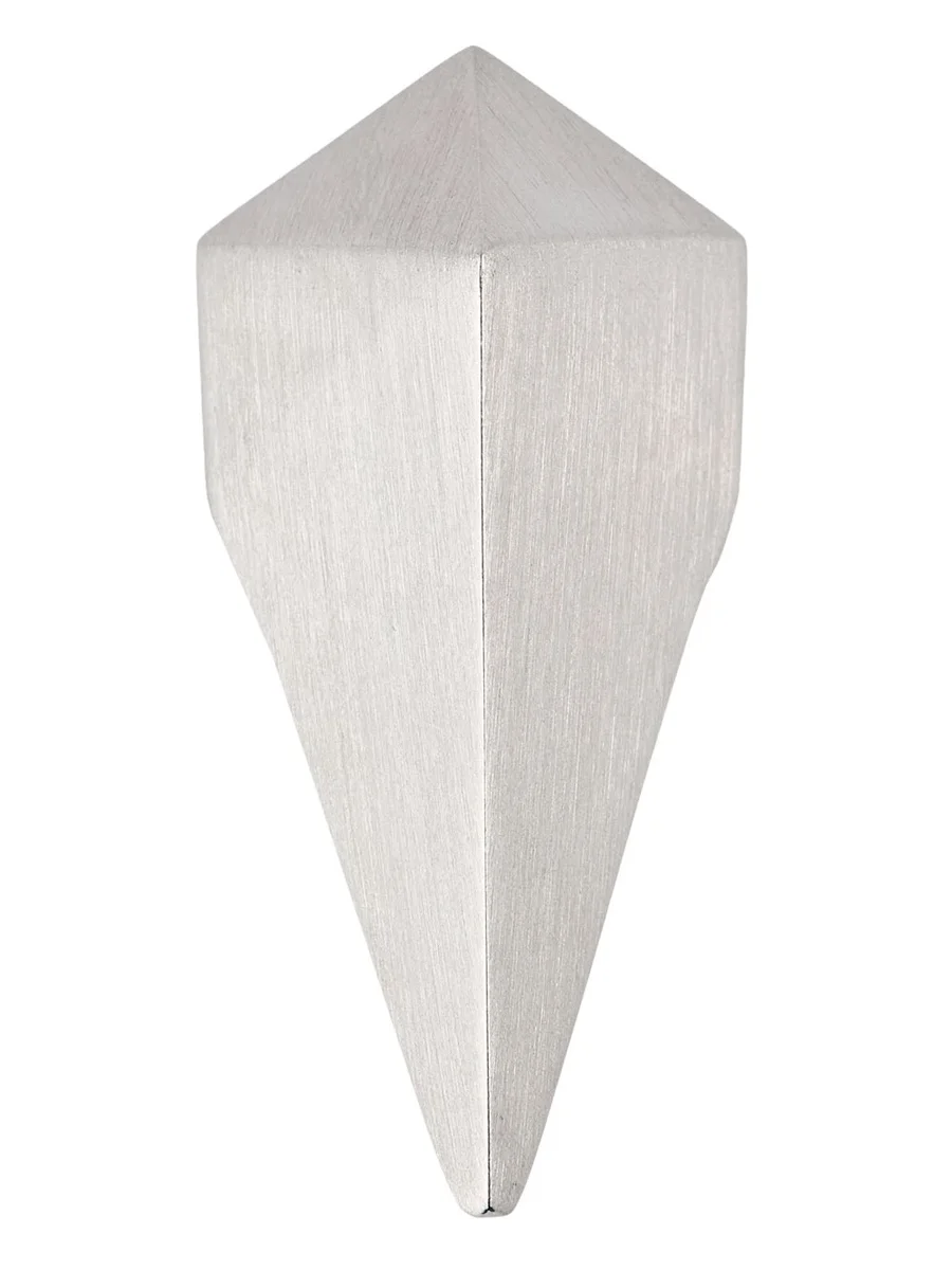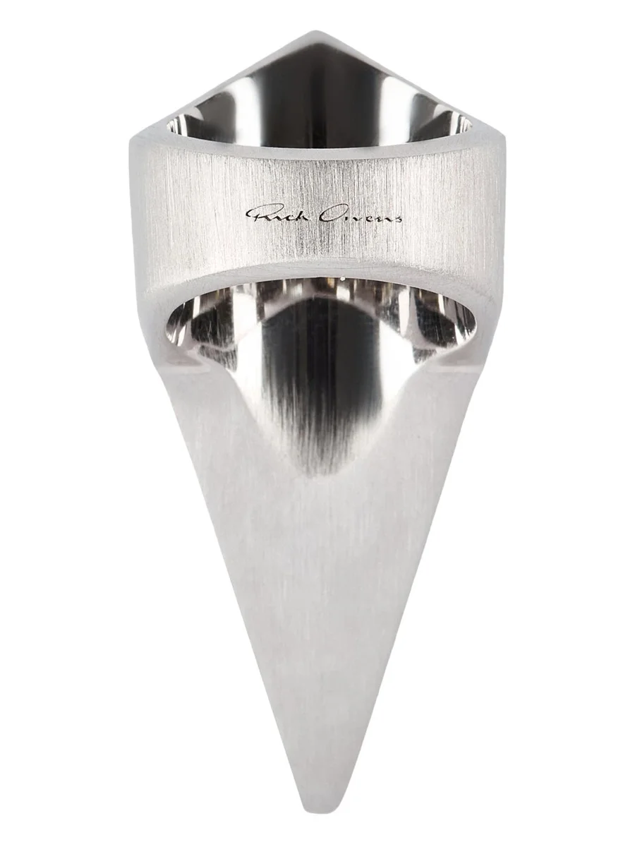 THIS PYRAMID RING IS A THICK BAND THAT EXTENDS INTO A GEOMETRIC PYRAMID SHAPE. IT HAS THE RICK OWENS LOGO ENGRAVED ON THE BACK.