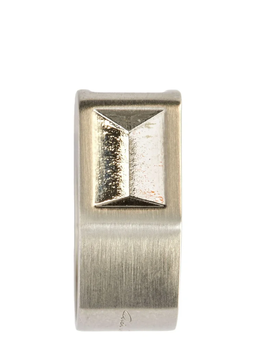 THIS IMPLODED RING IS A THICK BAND WITH EACH SIDE IMPLODING INWARDS. IT HAS THE RICK OWENS LOGO ENGRAVED ON THE BACK.