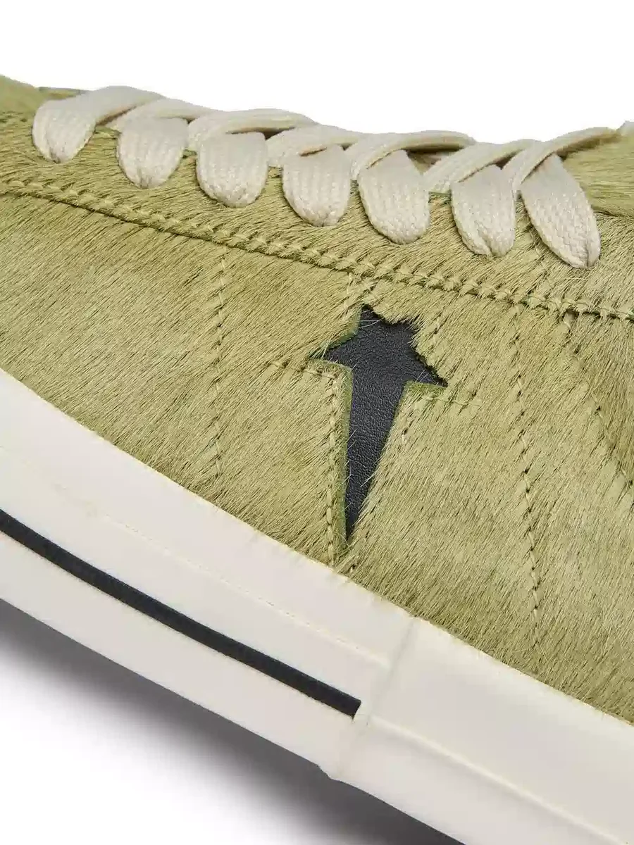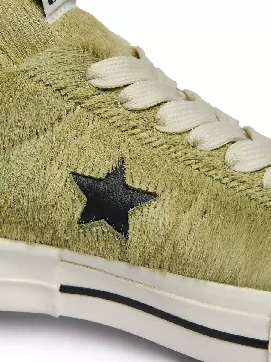 IT HAS A HAIR ON COWHIDE UPPER AND FEATURES A SIGNATURE DRKSHDW ELONGATED TONGUE WITH A BRANDED WRAP AROUND WOVEN LABEL BEARING THE MODEL NAME AND A CLASSIC CONVERSE SKATEBOARD ONE STAR CONVERSE SOLE, SANDWICHED BY A SIGNATURE RICK OWENS SNEAKS MOULDED RUBBER HEEL.