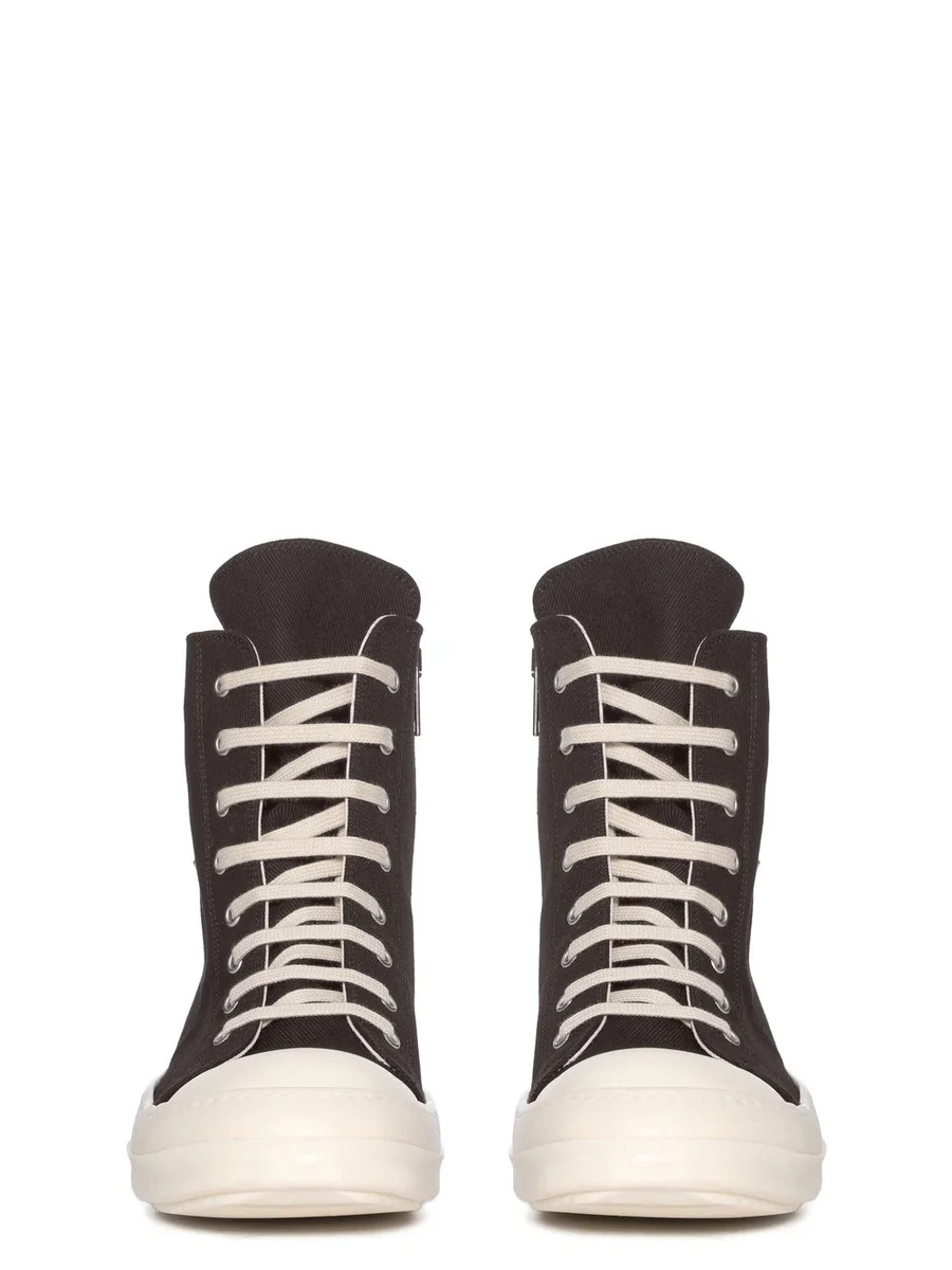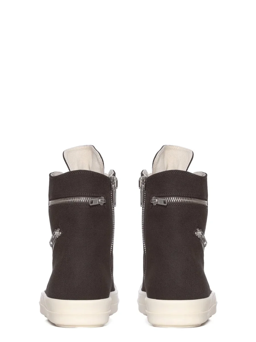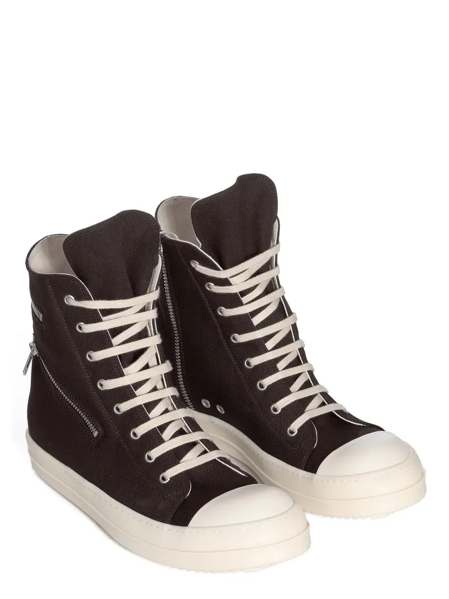 THESE CARGO SNEAKS ARE ABOVE-ANKLE HEIGHT AND FEATURE EIGHT EYELETS, LACES, A ZIPPER ON THE INSIDE ANKLE FOR EASY FASTENING, TOE CAPS AND SHARK TOOTHED BUMPER SOLES. THIS VERSION FEATURES AN ANGLED CARGO ZIPPER ON THE OUTER FOOT AND A HORIZONTAL ZIPPER AROUND THE ANKLE TOP.