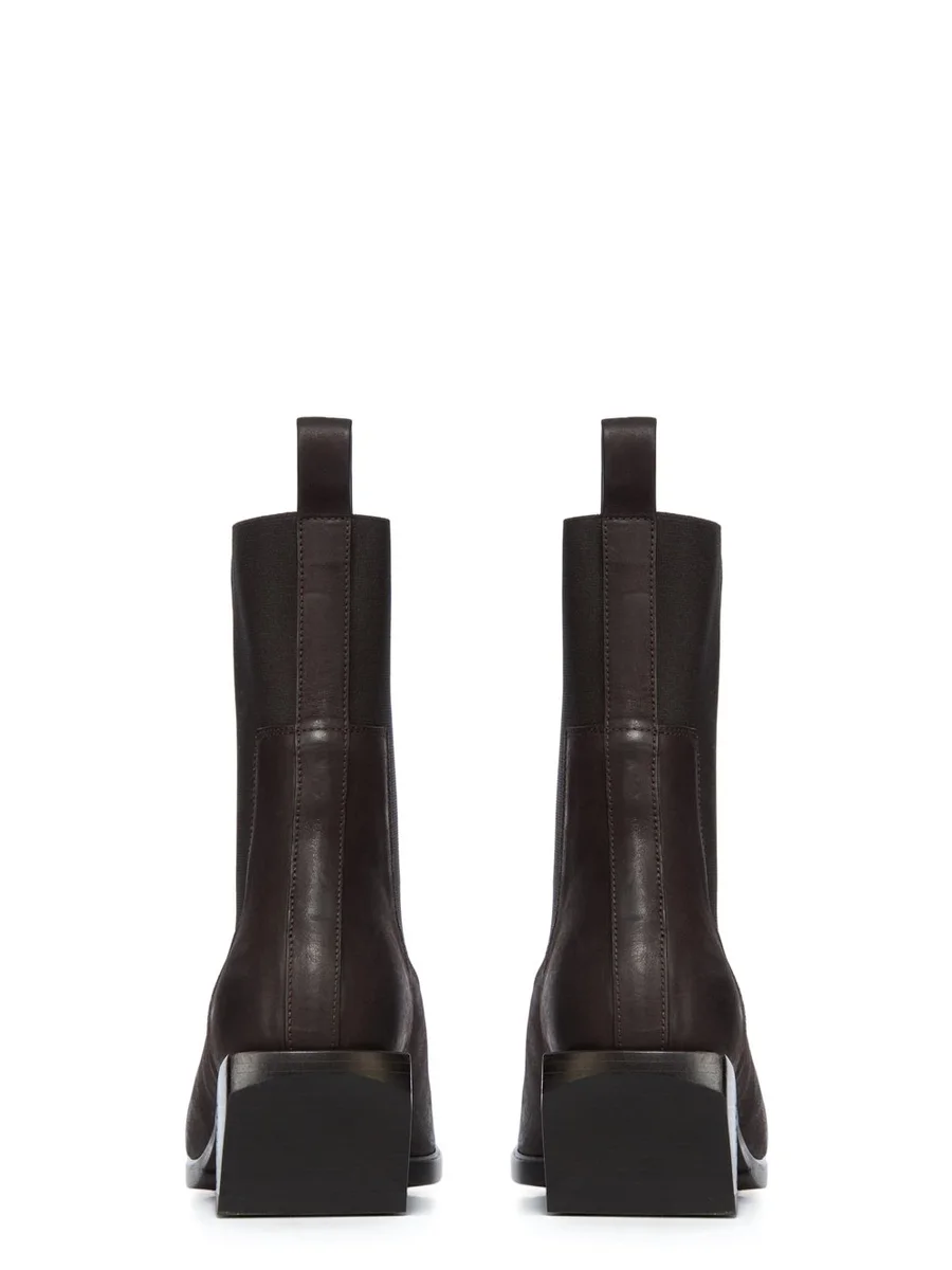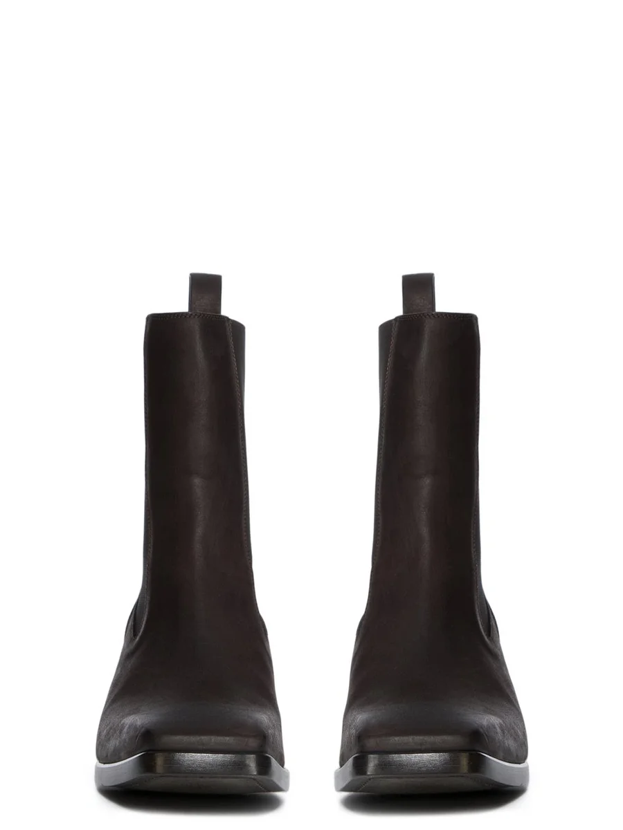THESE HEELED SLIVER BOOTS ARE ABOVE-ANKLE HEIGHT. THEY HAVE A SQUARE TOE AND SLANTING CUBAN STACKED LEATHER HEEL, SIDE GEOMETRIC SIDE PANELS IN STRETCH ELASTIC, AN ANGULAR HEEL COUNTER WITH TOP STITCHING AND A BACK LOOP PULL TAB.