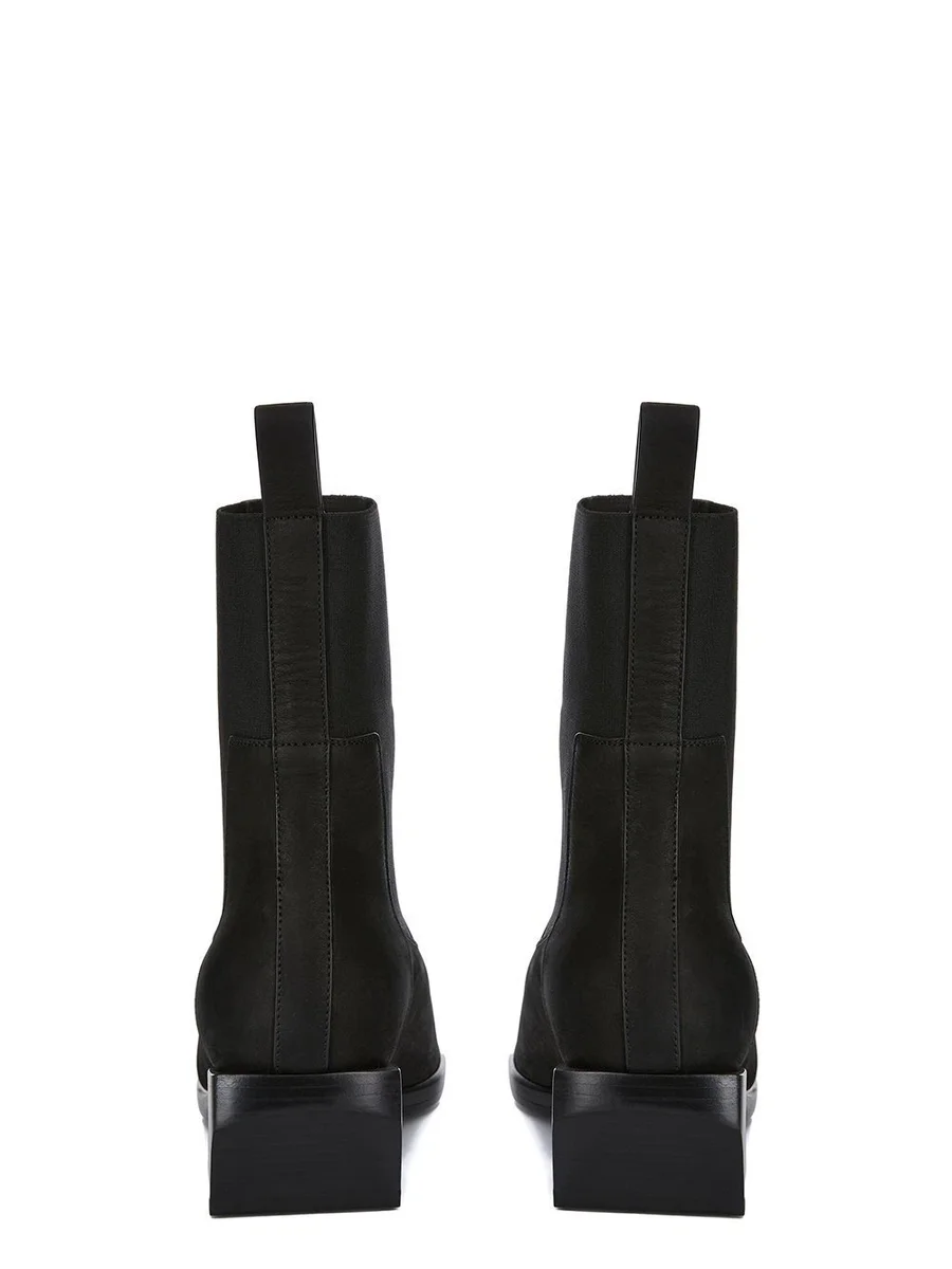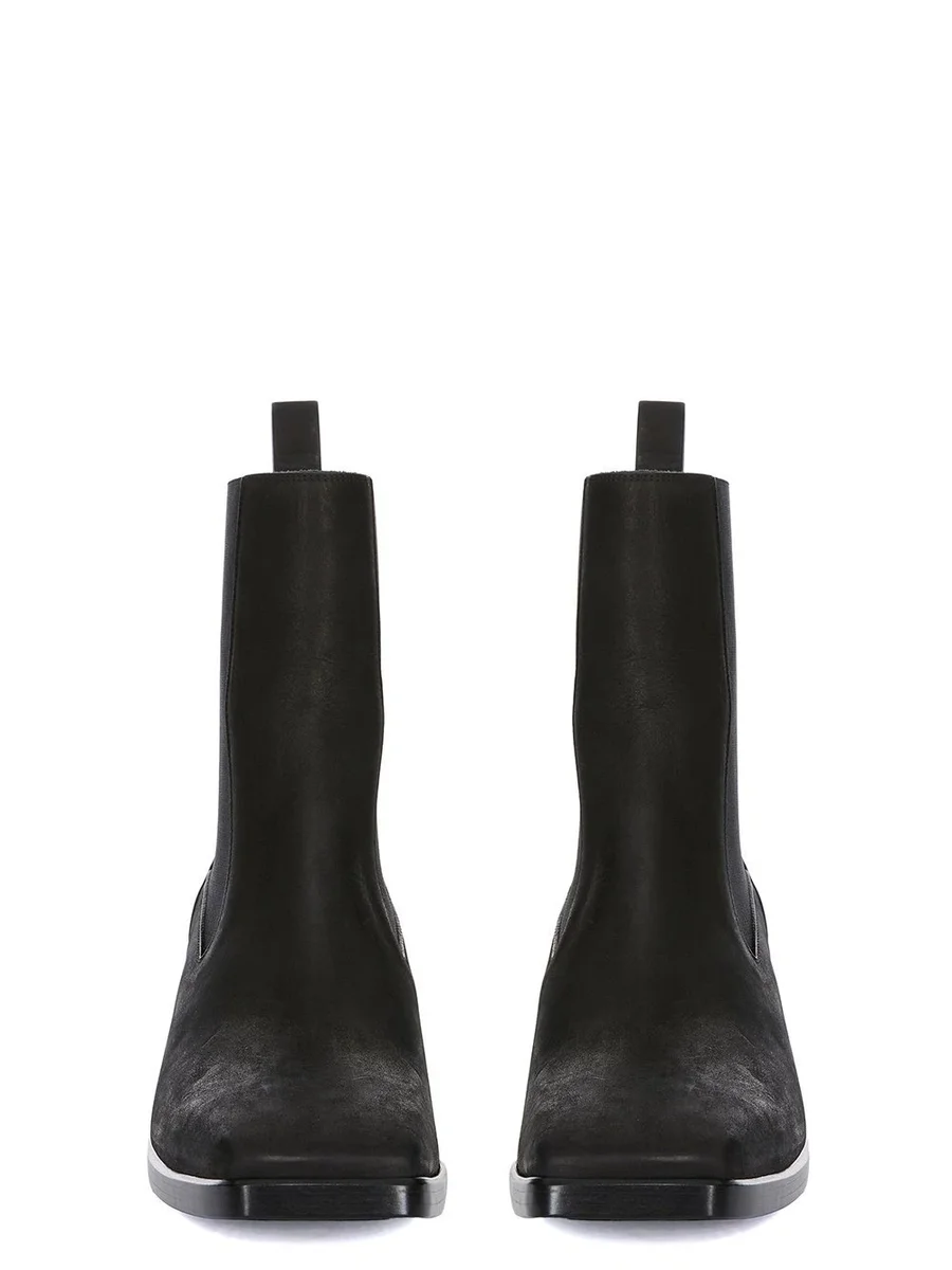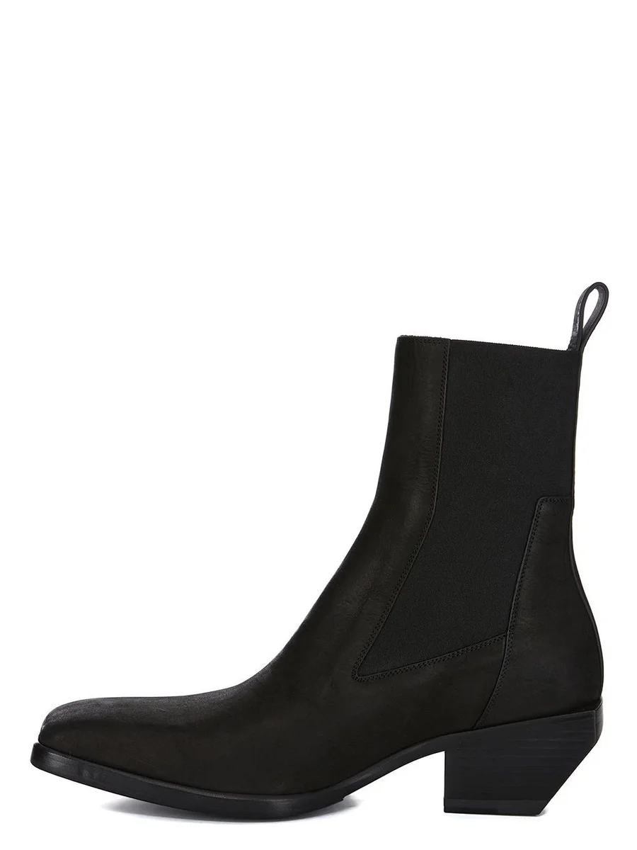 THESE HEELED SLIVER BOOTS ARE ABOVE-ANKLE HEIGHT. THEY HAVE A SQUARE TOE AND SLANTING CUBAN STACKED LEATHER HEEL, SIDE GEOMETRIC SIDE PANELS IN STRETCH ELASTIC, AN ANGULAR HEEL COUNTER WITH TOP STITCHING AND A BACK LOOP PULL TAB.