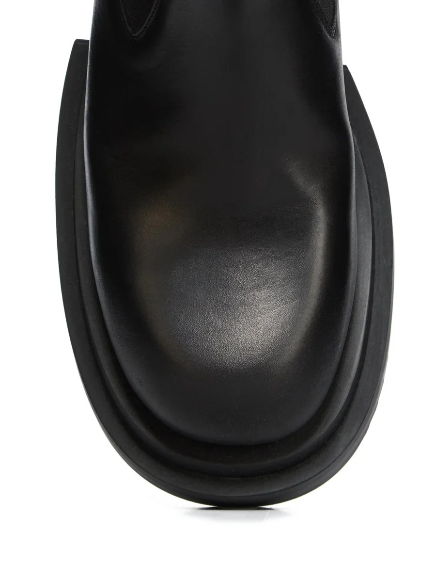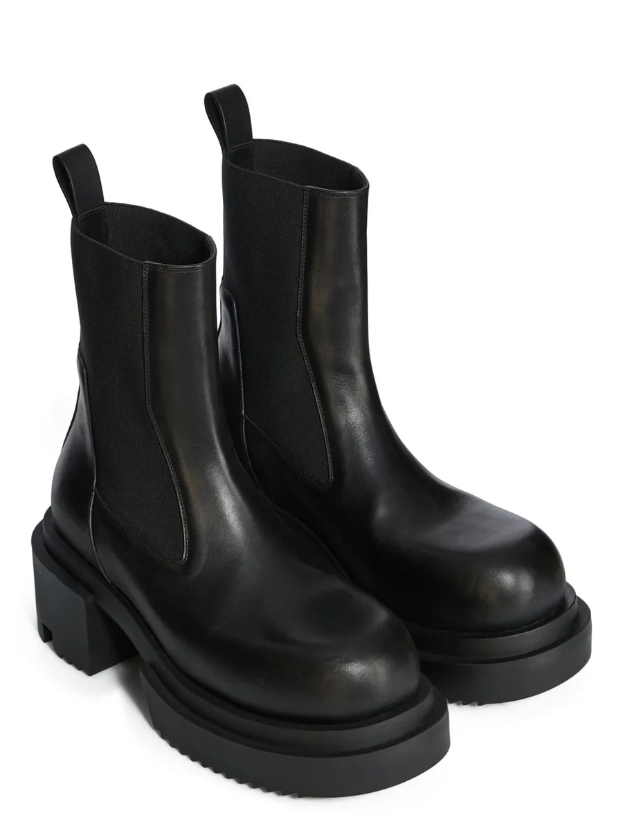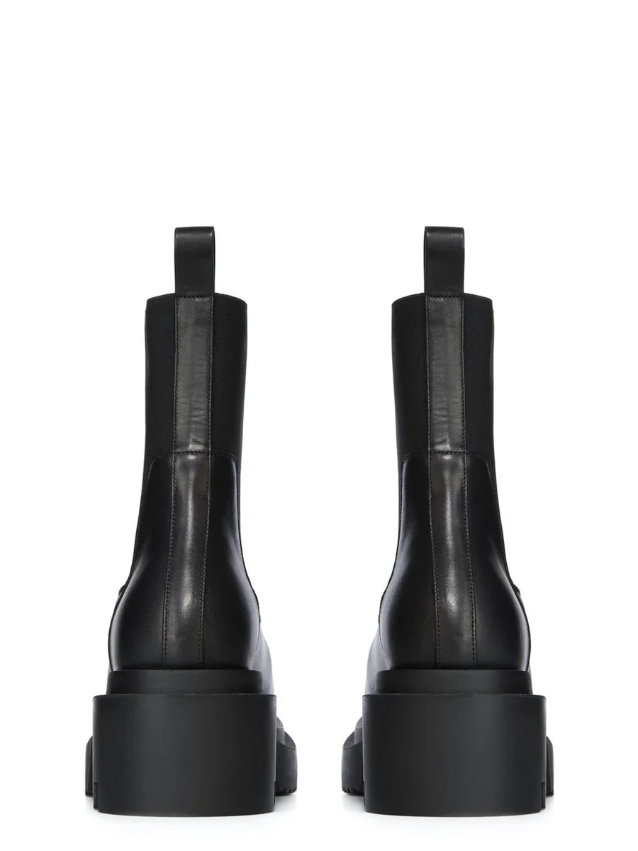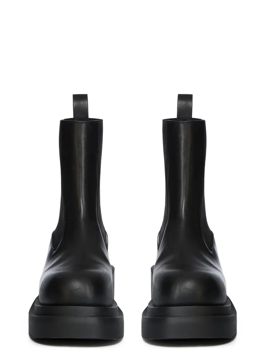 THESE BEATLE BOGUN BOOTS ARE ABOVE-ANKLE HEIGHT. THEY HAVE GEOMETRIC SIDE PANELS IN STRETCH ELASTIC, AN ANGULAR HEEL COUNTER WITH TOP STITCHING AND A BACK LOOP PULL TAB. THEY HAVE A ROUNDED TOE AND FEATURE A BOGUN RUBBER MEGA CREEPER SOLE WITH A TOOTHED SQUARE HEEL.
