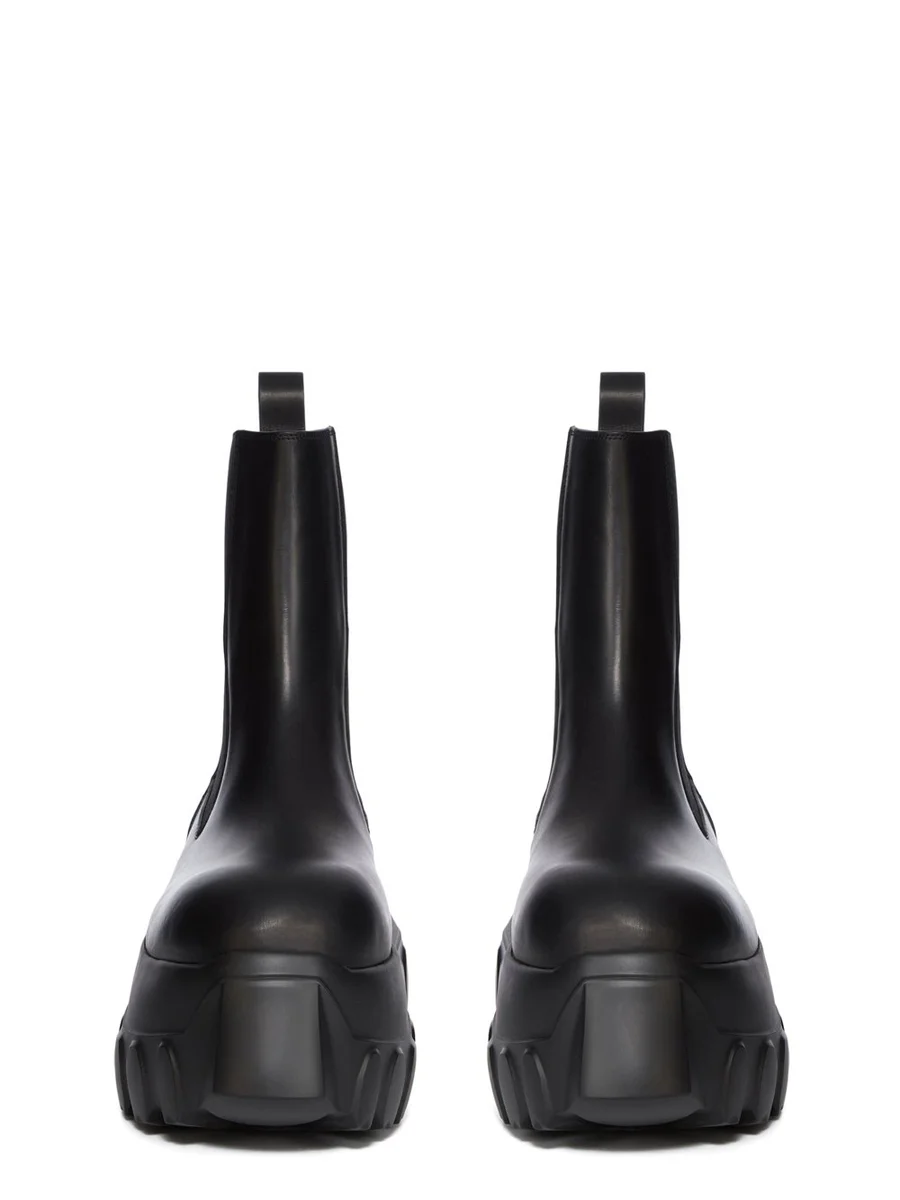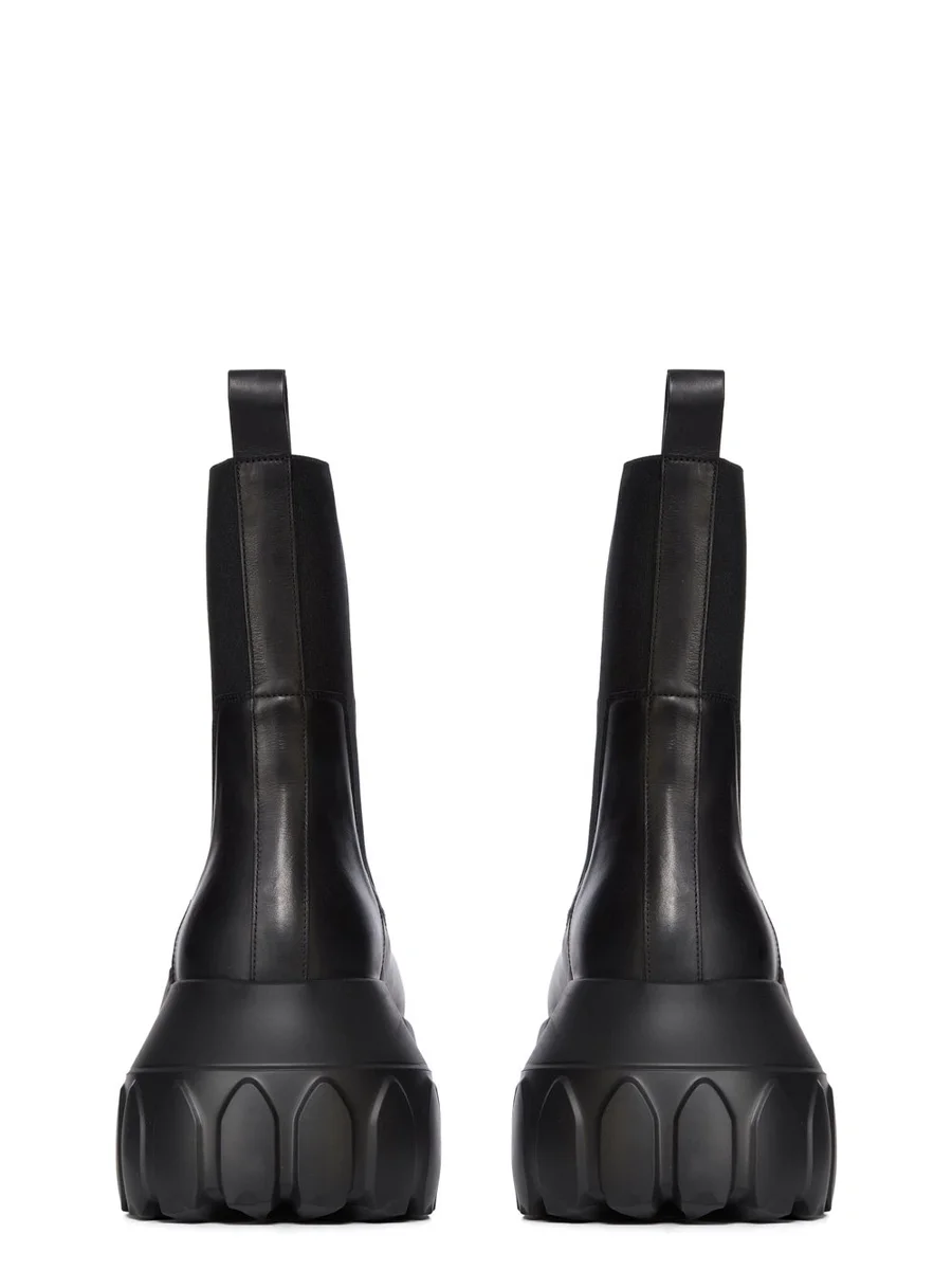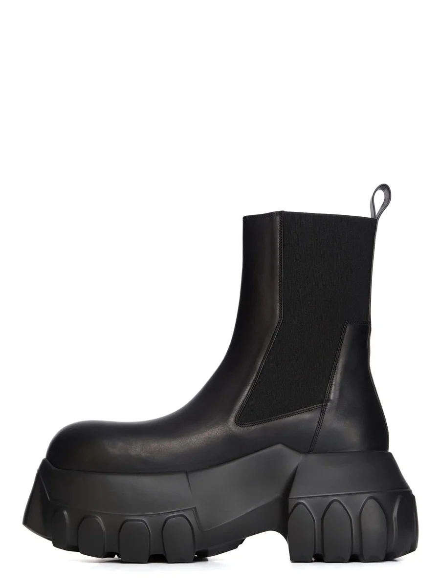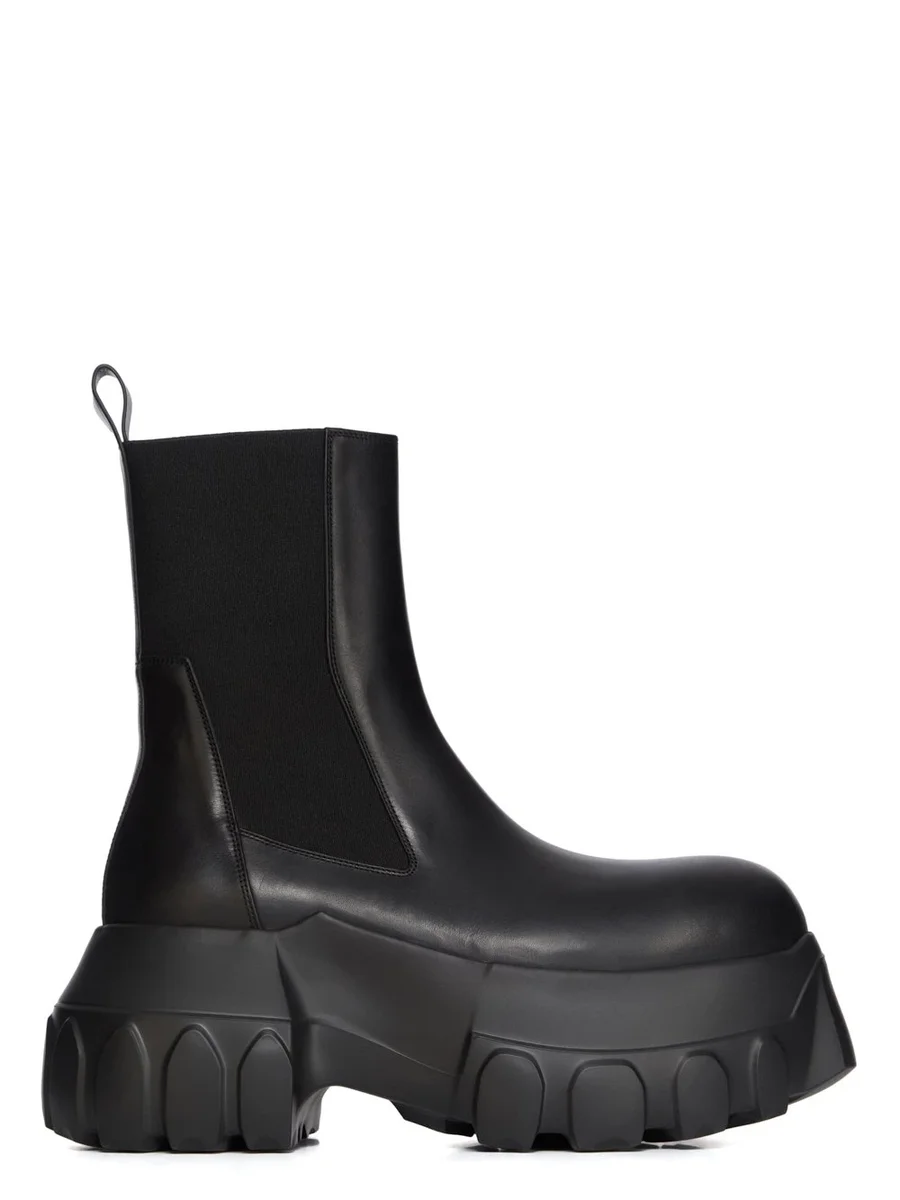 THESE BEATLE MEGA TRACTORS ARE ABOVE-ANKLE HEIGHT. THEY HAVE GEOMETRIC SIDE PANELS IN STRETCH ELASTIC, AN ANGULAR HEEL COUNTER WITH TOP STITCHING, A BACK LOOP PULL TAB AND A ROUNDED BOZO TOE. THEY FEATURE A DOUBLE HEIGHT MEGA TRACTOR SOLE.