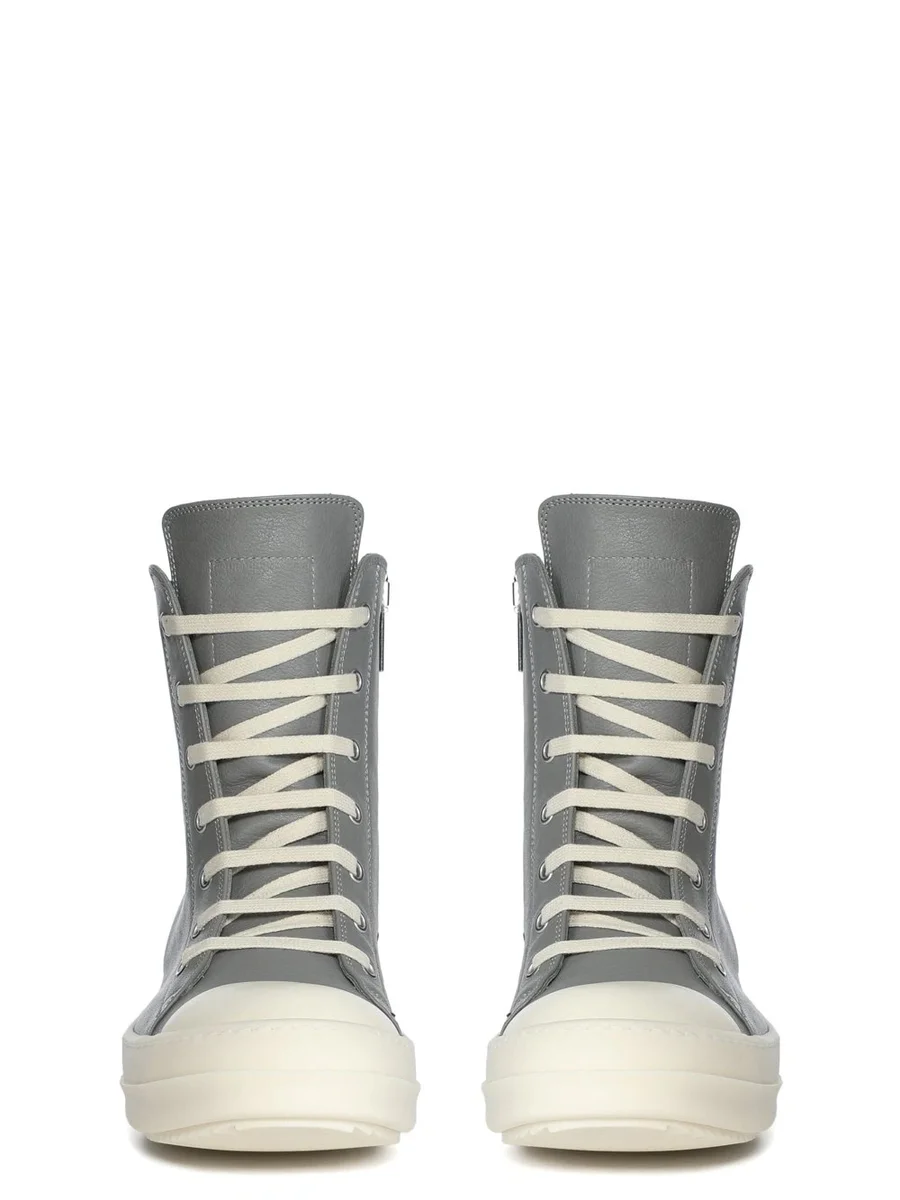 THESE SNEAKERS ARE ABOVE-ANKLE HEIGHT AND FEATURE SEVEN EYELETS, LACES, A ZIPPER ON THE INSIDE ANKLE FOR EASY FASTENING, TOE CAPS AND SHARK-TOOTHED BUMPER SOLES.
