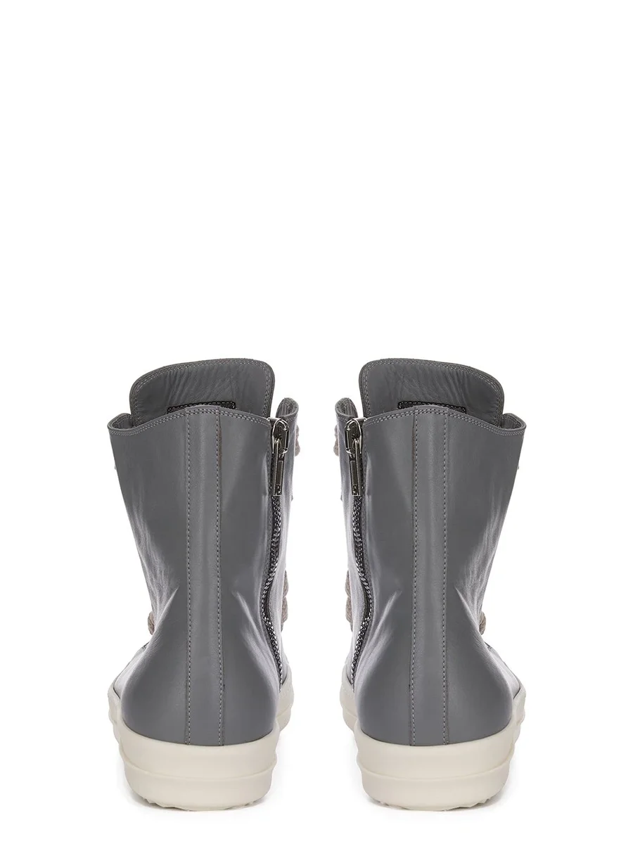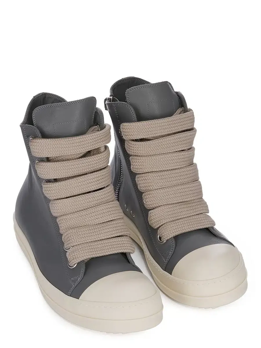 THESE JUMBOLACE SNEAKERS ARE ABOVE-ANKLE HEIGHT AND FEATURE EYELETS, JUMBO LACES, A ZIPPER ON THE INSIDE ANKLE FOR EASY FASTENING, TOE CAPS AND SHARK-TOOTHED BUMPER SOLES.